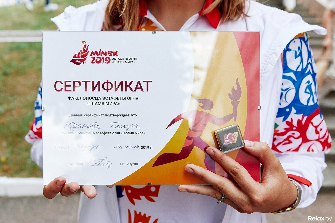 Маршрут эстафеты огня «Пламя мира» по Мозырю завершился на площади Ленина. На главную сцену города огонь вынесла уроженка Мозыря и победитель детского «Евровидения-2005» Ксения Ситник.