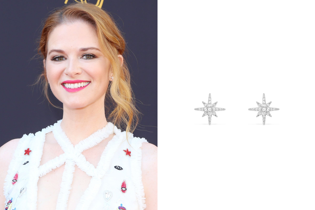 На съемках отметились и серьги в виде звездочек, усыпанных камушками. Если вы хотите такие же, обратите внимание на украшения от бренда APM Monaco. В коллекции этого бренда есть аналогичные модели сережек в серебряном варианте.