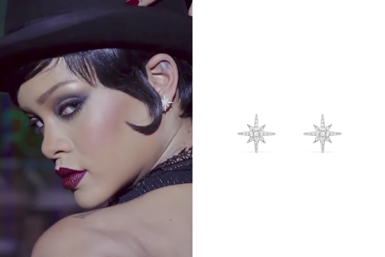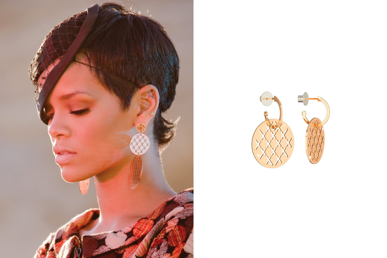 Американская R`n`B и поп-исполнительница Рианна имеет в своем «арсенале» десятки невероятных украшений. Например, для очередного видеоклипа певица выбрала эффектные серьги-диски золотого оттенка от Rebecca. Образ дополнила вуалеткой и пирсингом.