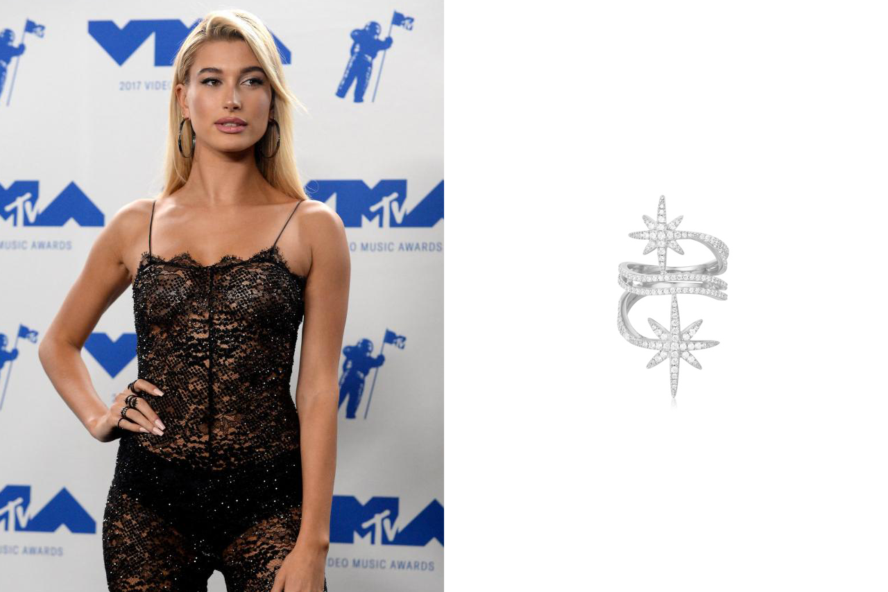 С этим же кольцом в свет вышла дочь актера Стивена Болдуина, а также супруга певца Джастина Бибера — Хейли Болдуин. Этим украшением она дополнила свой роскошный кружевной комбинезон, который выбрала для церемонии вручения премии MTV Music Awards.