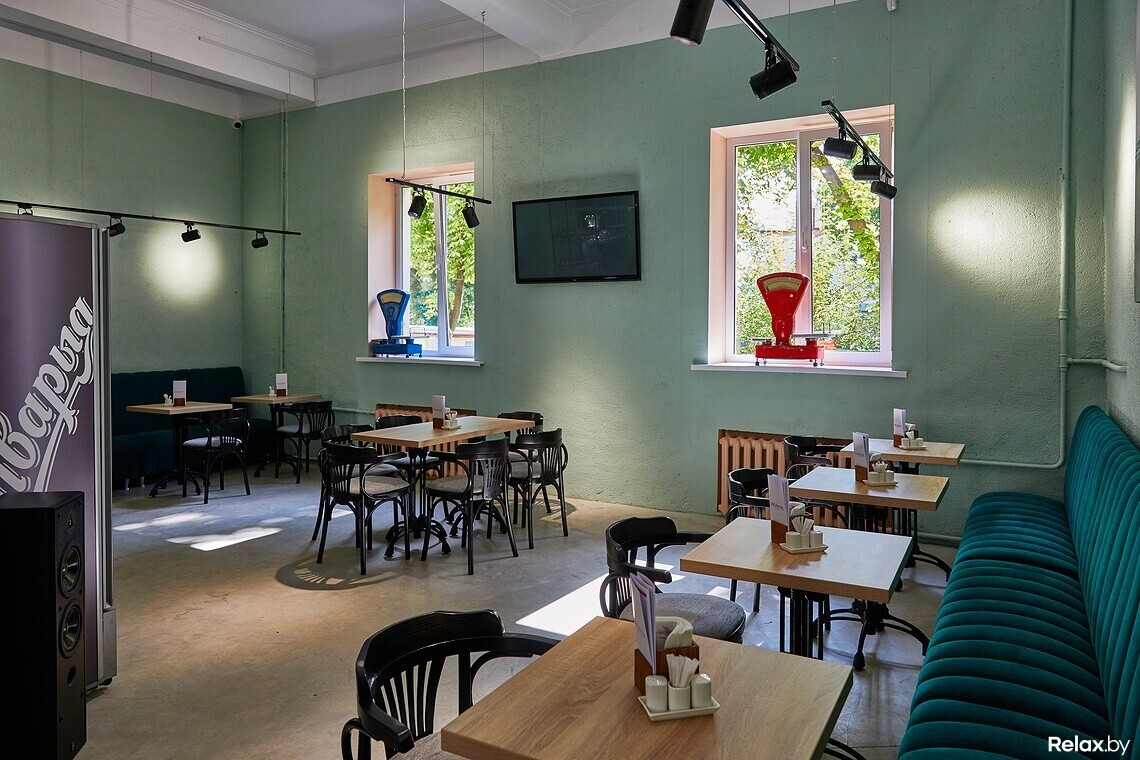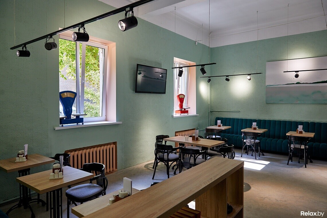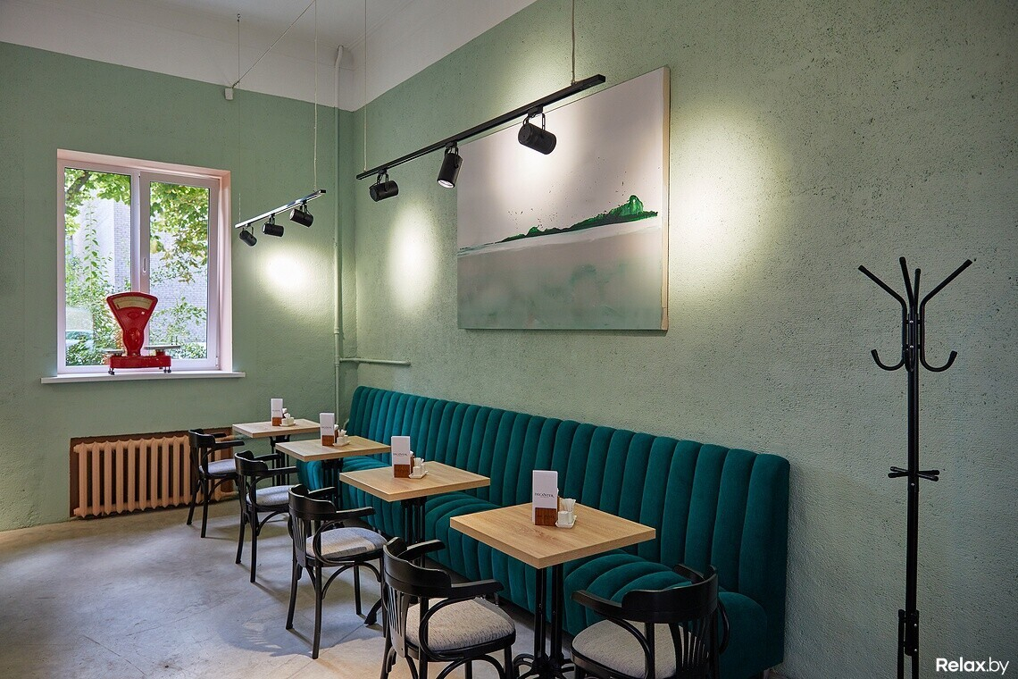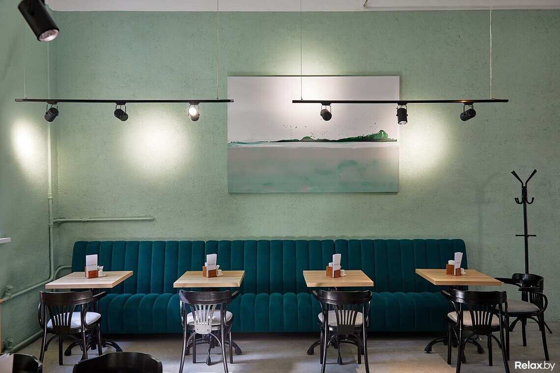 В светлом зале с арочными окнами разместится 35 человек. Столики располагаются близко: в духе маленьких европейских кафе. У здания насыщенное советское прошлое, и эту историю решили изящно поддержать. Дизайн объединил элементы лофта и сталинского ампира. Завершают общую картину абстрактные полотна художника Алексея Кузнецова.