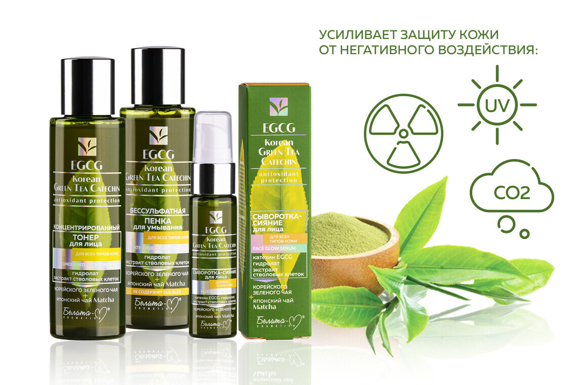 Линия EGCG Korean GREEN TEA CATECHIN — это мощная антиоксидантная защита для всех типов кожи, созданная на основе концентрированной силы четырех активных компонентов зеленого чая, который выращивается в экологически чистых районах корейского острова Чеджу: