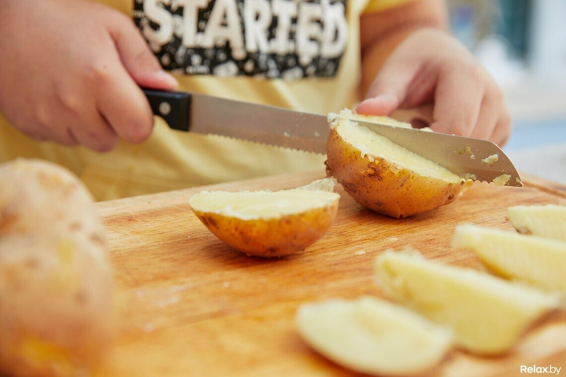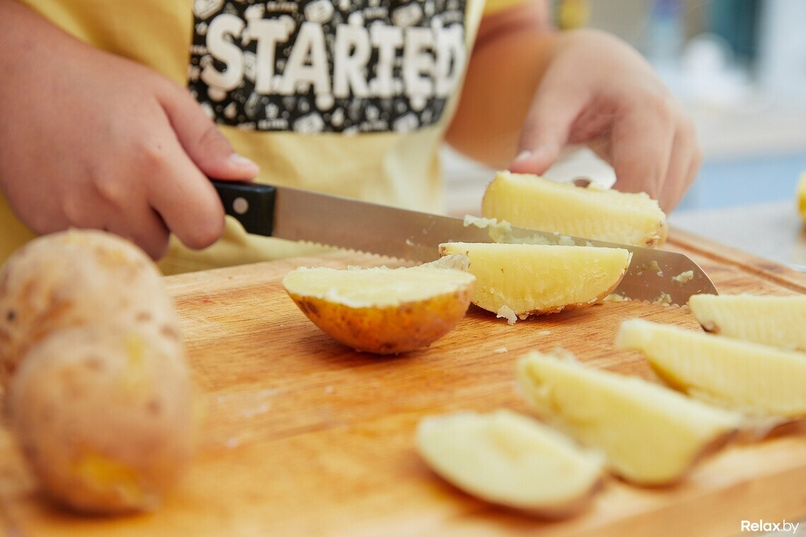 Первый этап — подготовка продуктов. Мы моем картофель, заливаем его водой и варим 20-30 минут. По готовности сливаем воду и нарезаем дольками. Ребятам нравится картофель с кожурой: ее они оставляют. Но если вы противник такого подхода, можете смело кожуру снимать. Ошибкой это не будет. Главное, чего следует придерживаться, — ваш вкус. На него и полагайтесь.