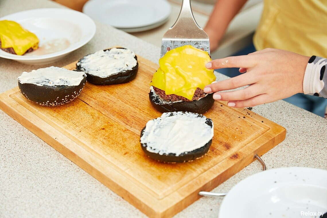 — Это мой первый, собственноручно приготовленный бургер, — улыбается Даник, помогая своей коллеге раскладывать запеченный картофель и сырный соус.
