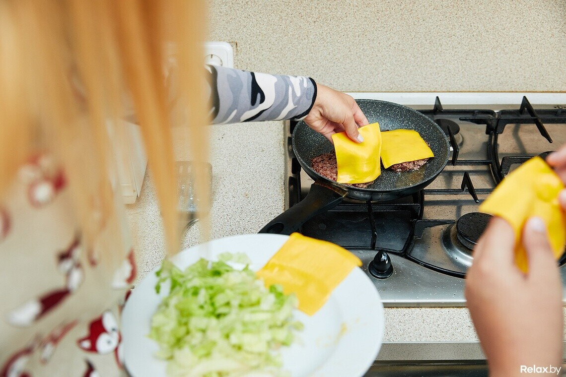 На кухне уже ароматно пахнет котлетами и плавленым сыром. Но это еще не все: нужно обжарить булочки со стороны разреза. Даник прогревает сковороду и профессионально заявляет, что долго держать их не будем: «иначе спалим хлеб».