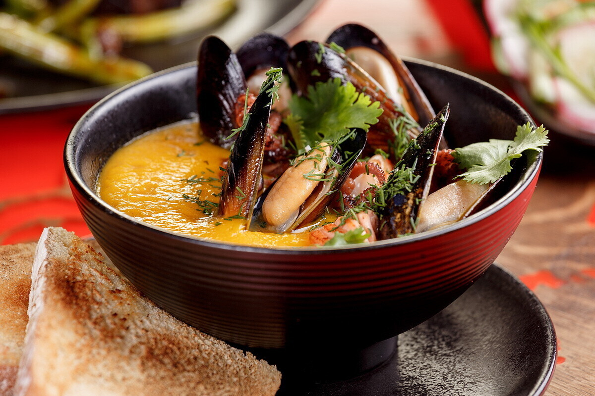 - Бузара с морепродуктами (осьминог беби, мидии в створках, креветка тигровая, филе форели) и «деревенским» хлебом