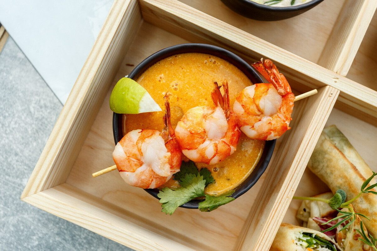 - Суп Том Ям (Tom Yam) Бульон Том Ям, кокосовое молоко, креветки тигровые, морской гребешок, шампиньоны, перец чили, лайм