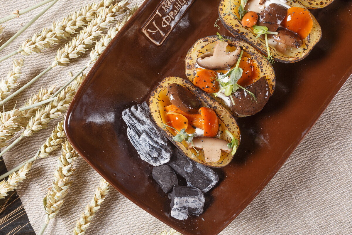 - Печеный картофель с маринованными грибочками. Подается с углями