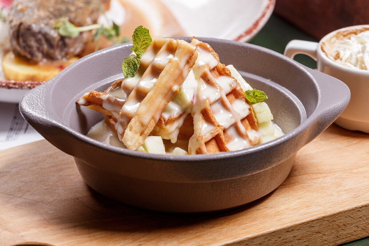 - Кофе по-венски с десертом: венские вафли с ванильным соусом и яблоком в меду