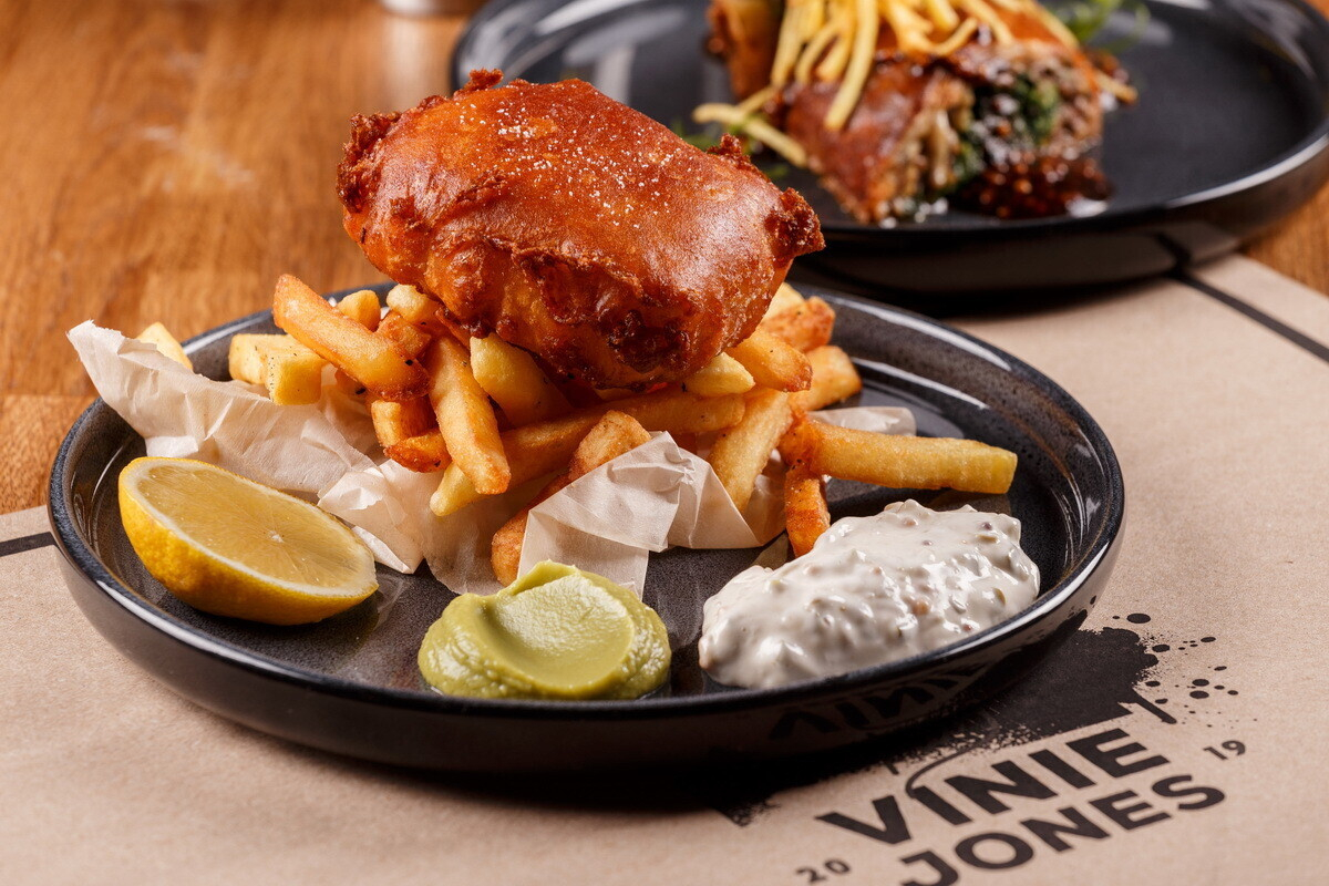 - Фиш-энд-чипc с мятно-гороховым пюре