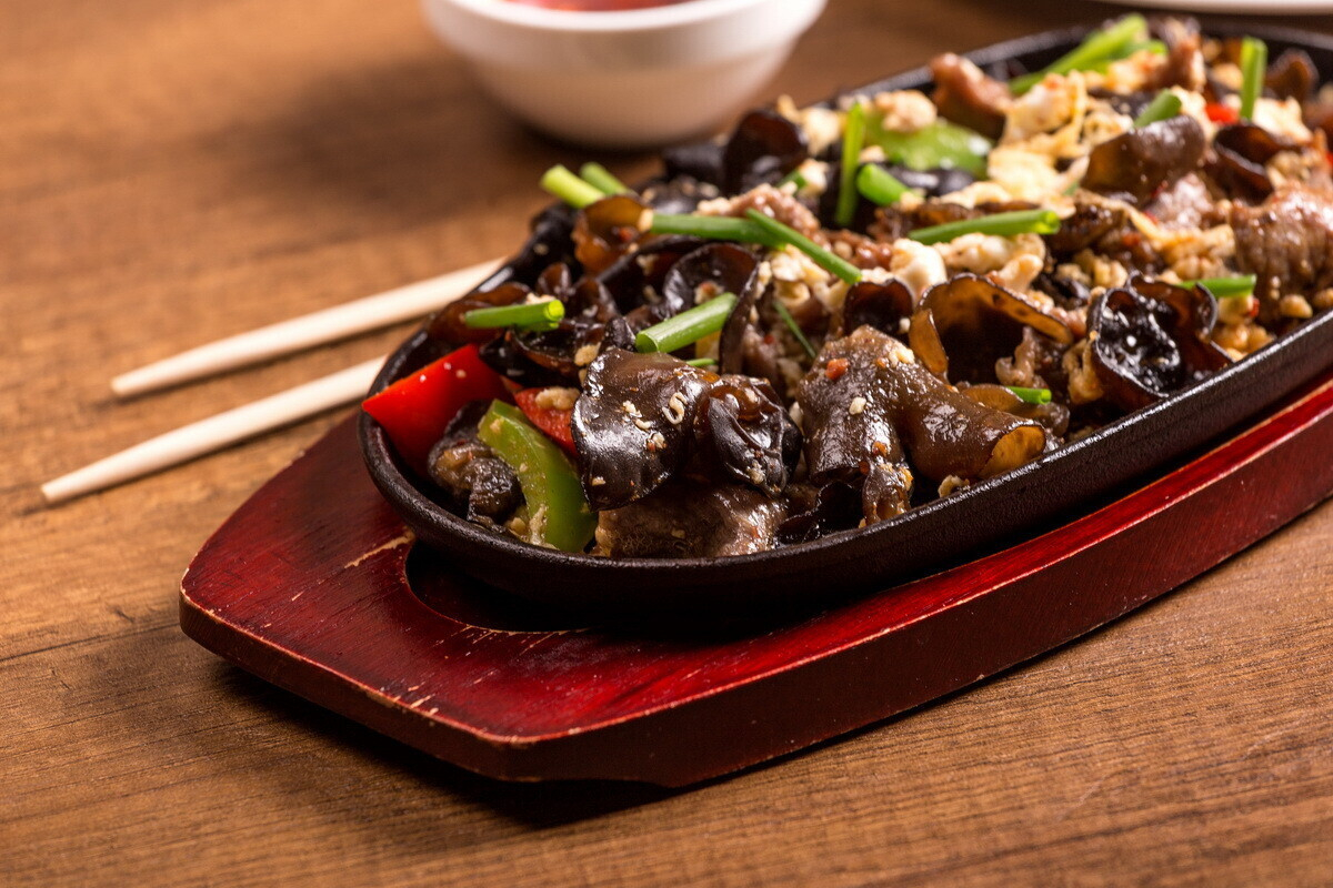 - Мошуру сяй – нежные кусочки говядины с древесными грибами на раскаленной сковородке, восточные специи, овощи и воздушный омлет