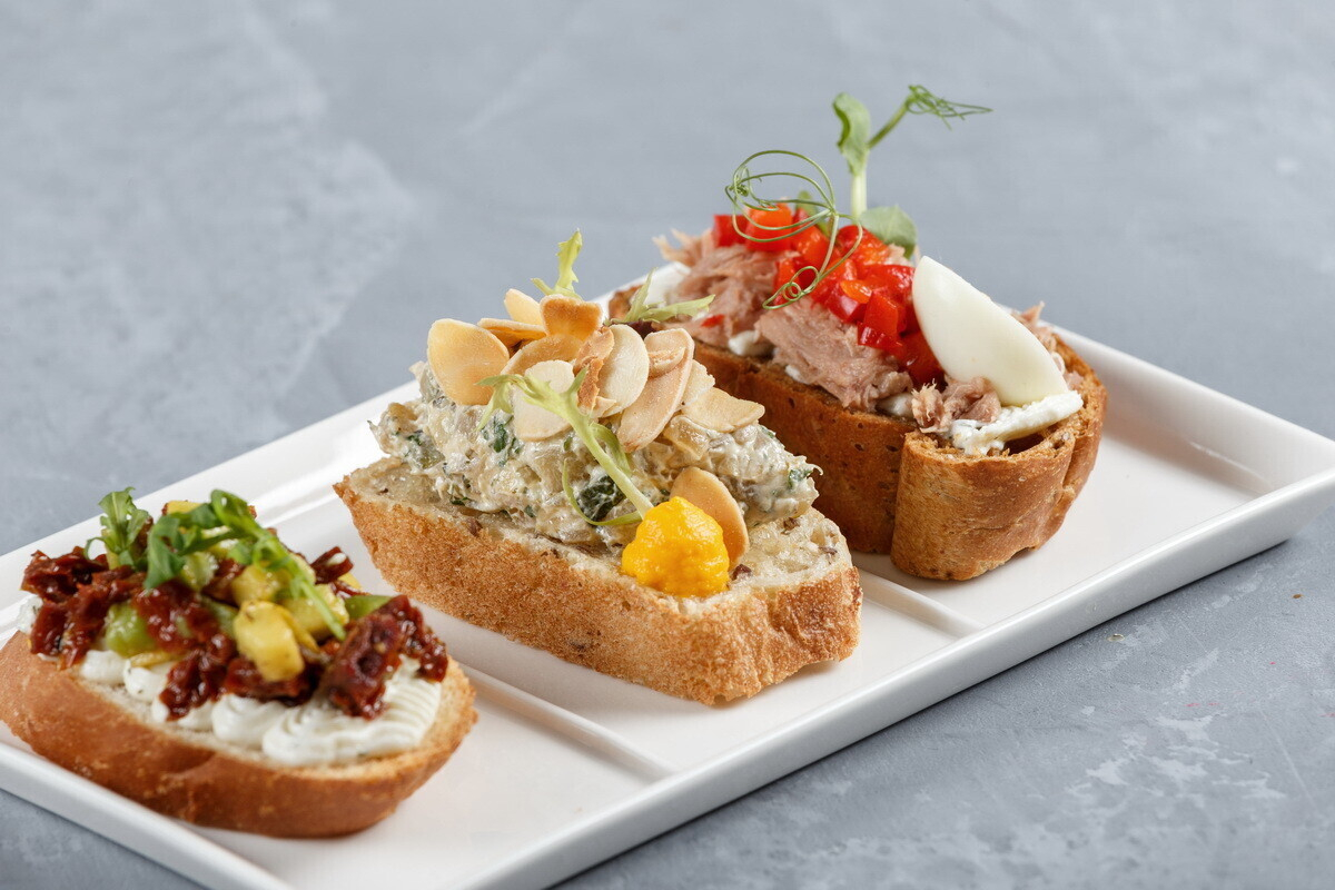 - 3 вида брускетт (брускетта с вялеными томатами, брускетта с кабачком, брускетта с тунцом)