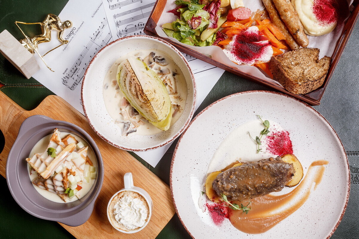 - «Тафельшпиц» – томленая говяжья лопатка с соусом из печёного яблока, сливочного хрена на печёном картофеле под мясным соусом