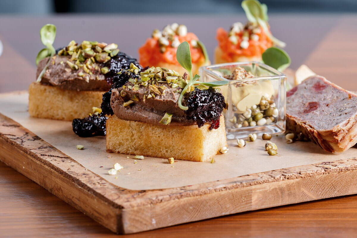 - Бриошь с печёночным паштетом, джемом из чёрной смородины и рублеными фисташками