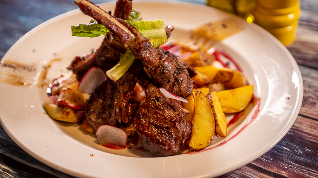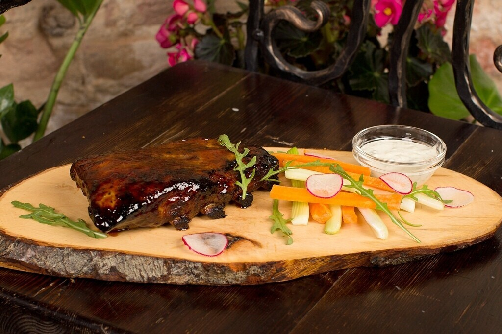 Нежнейшие ребра, запеченные в соусе на основе виски. Подается с миксом из свежих овощей и соусом блю-чиз (24 рубля)