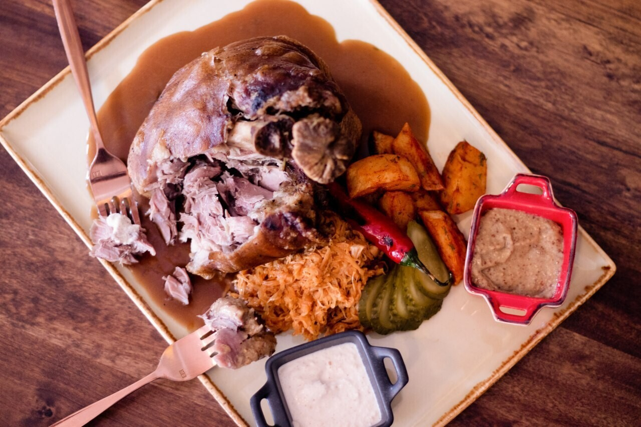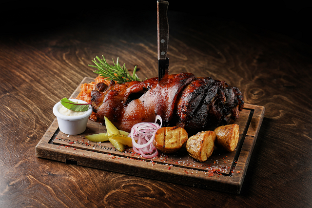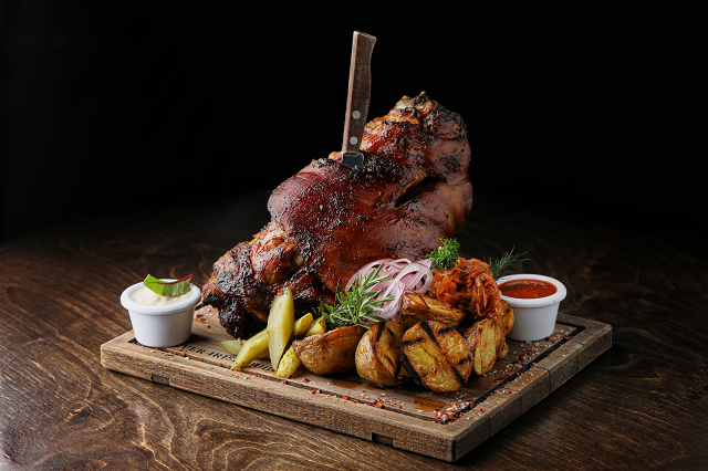 Томленая рулька в пиве с картофелем гриль, капустой и хреном (20 рублей)