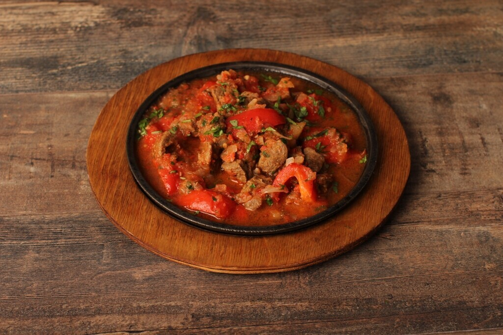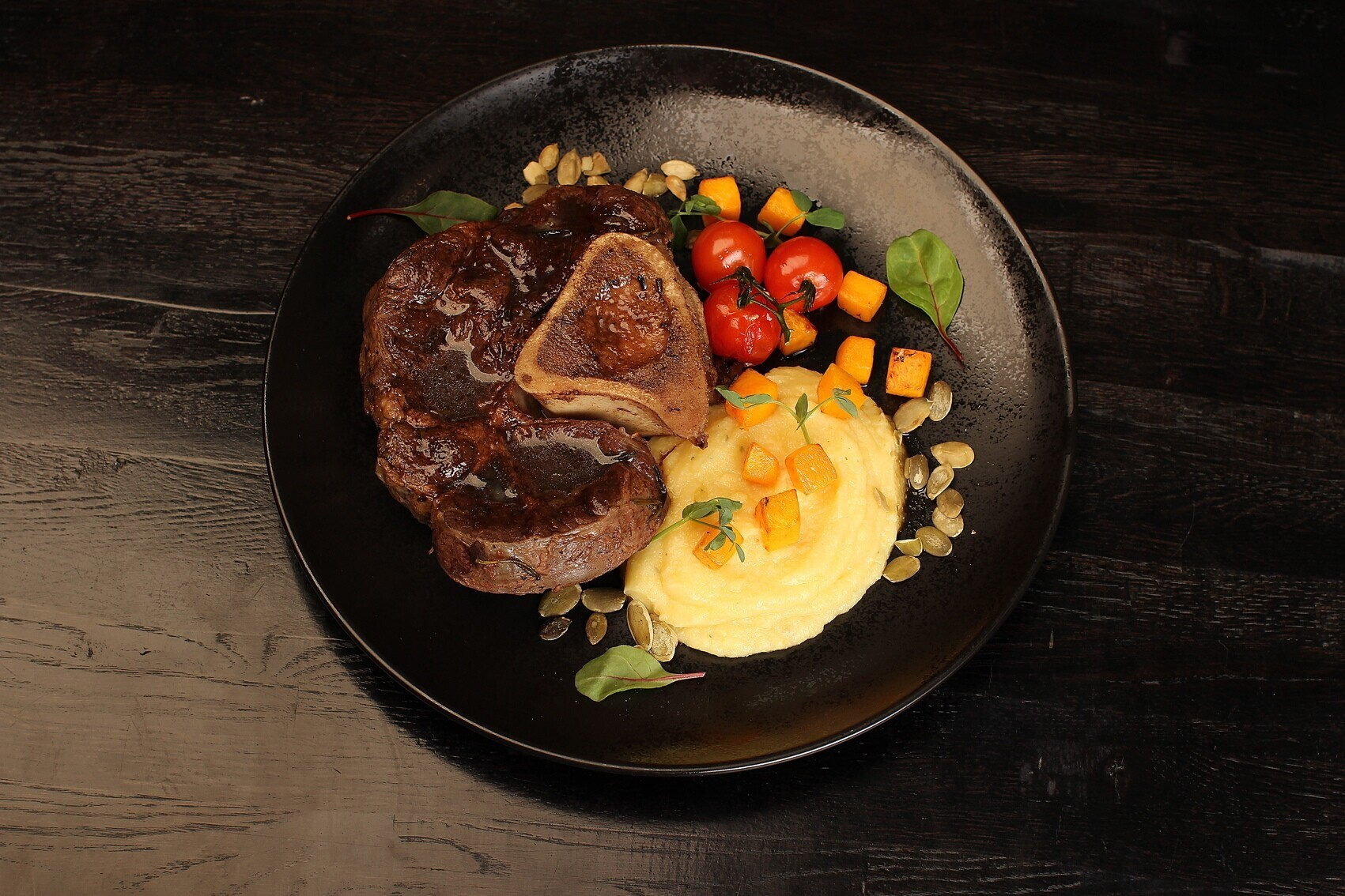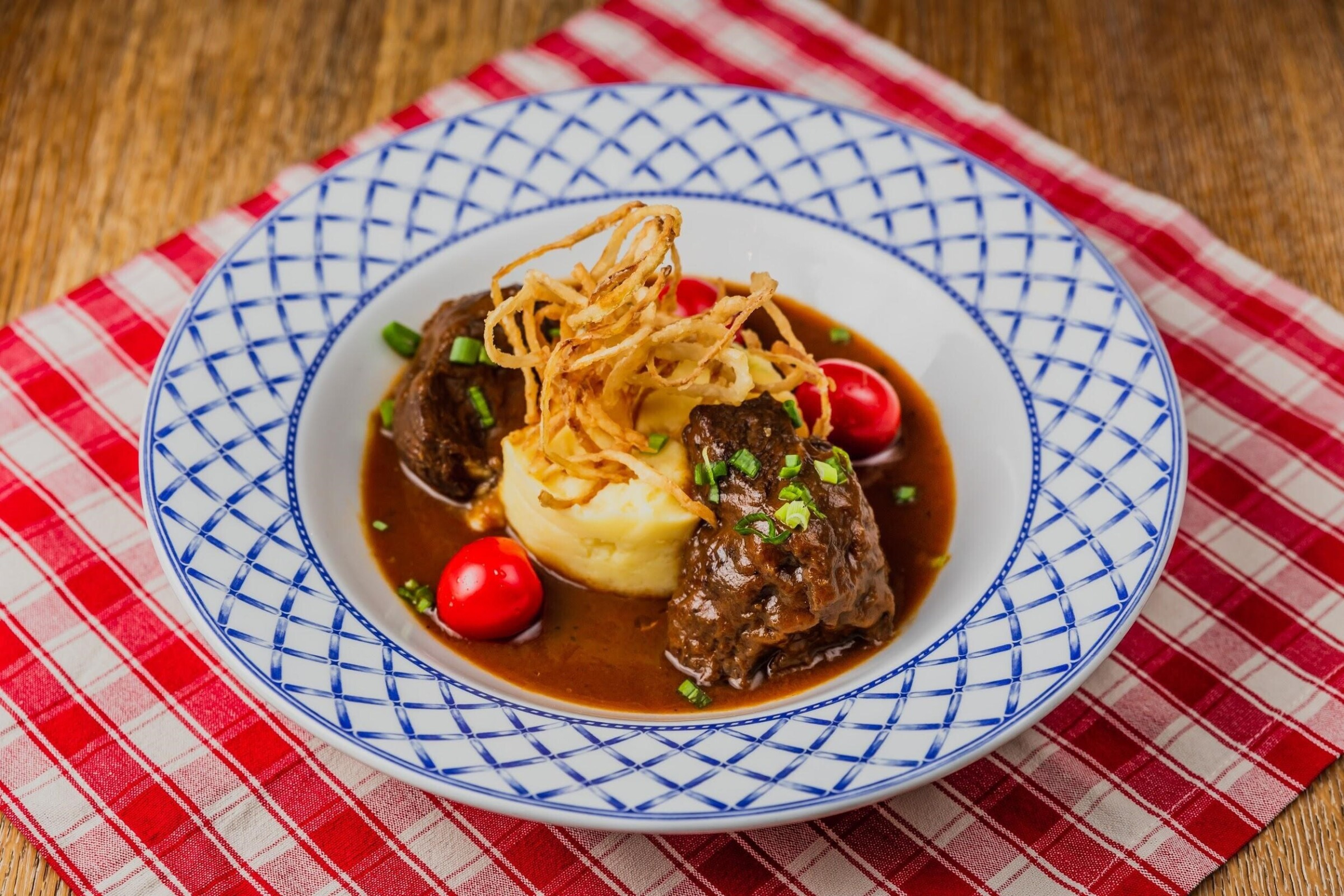 Мягкие и сочные говяжьи щечки, томленные 4 часа в соусе из спелых томатов, чеснока, лука и красного вина, подаются с запеченным картофелем, томатами черри и луковыми чипсами (16 рублей)