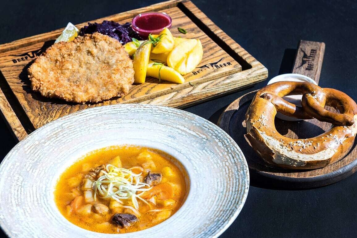 Брецель с абацдой (6 рублей), суп «Айнтопф» (8 рублей), мюнхенский шницель с запеченным картофелем и красной капустой (22 рубля).
