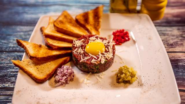 Ростбиф с пудингом и вишневым соусом на коньяке (22,5 руб.), стейк с клюквенным джемом (24,5 руб.), бефстроганов из говядины (15,5 руб.), рулька к пиву (4,5 руб. за 100 г), говядина в кленовом сиропе на овощах в хоспере (15,5 руб.).