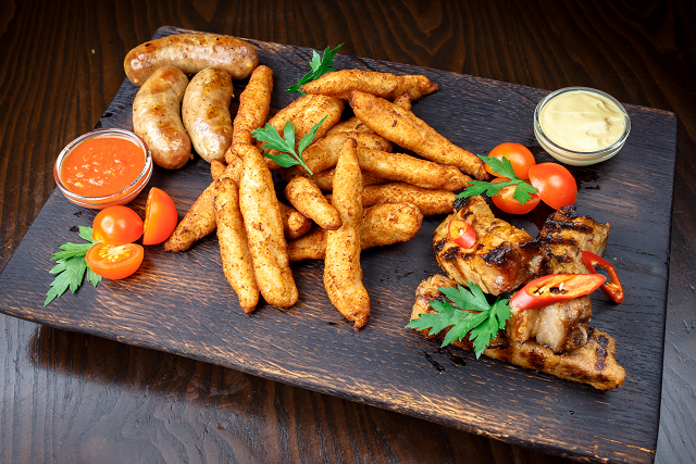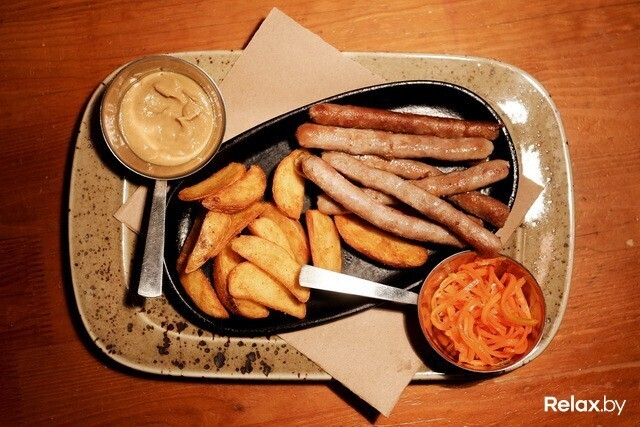 Большая колбаса из рубленой говядины и свинины. Подается с обжаренным картофелем, миксом разносолов, свежих овощей и тремя видами соусов. Рекомендуется на двоих (28 рублей) Как будут отмечать?