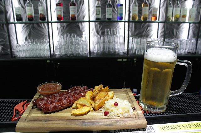 Ирландский картофельный салат с беконом (15 руб.), немецкие колбаски с пряной капустой (16 руб.), томленая рулька в пиве с картофелем гриль, капустой и хреном (20 руб.), томленая рулька в пиве с картофелем гриль на компанию (39 руб.). Пиво — от 7,9 руб. за 500 мл.