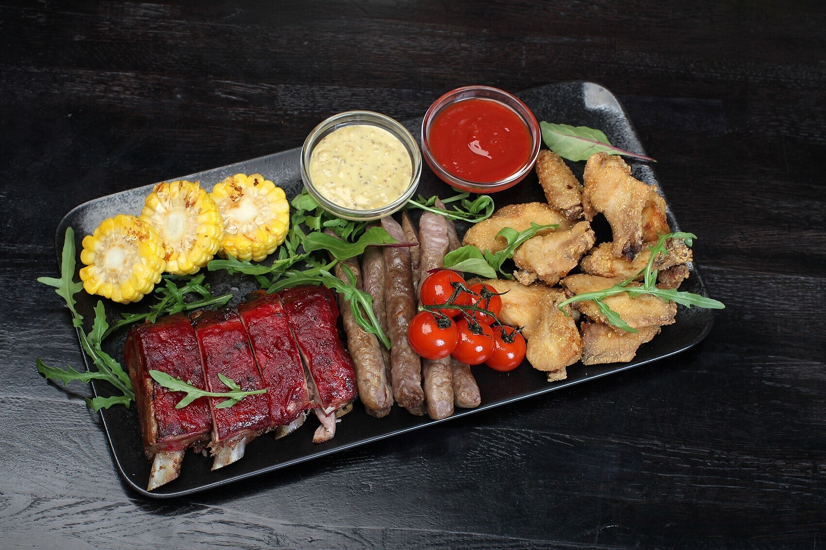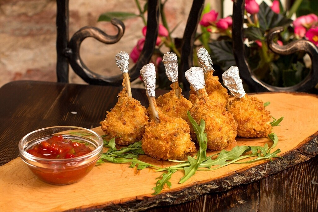 Фирменная колбаса по-брюссельски (28 руб.), свиные ребра в карамельной глазури sous-vide (24 руб.), крылышки Lollipop с соусом чили (12 руб.).