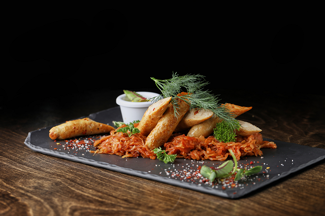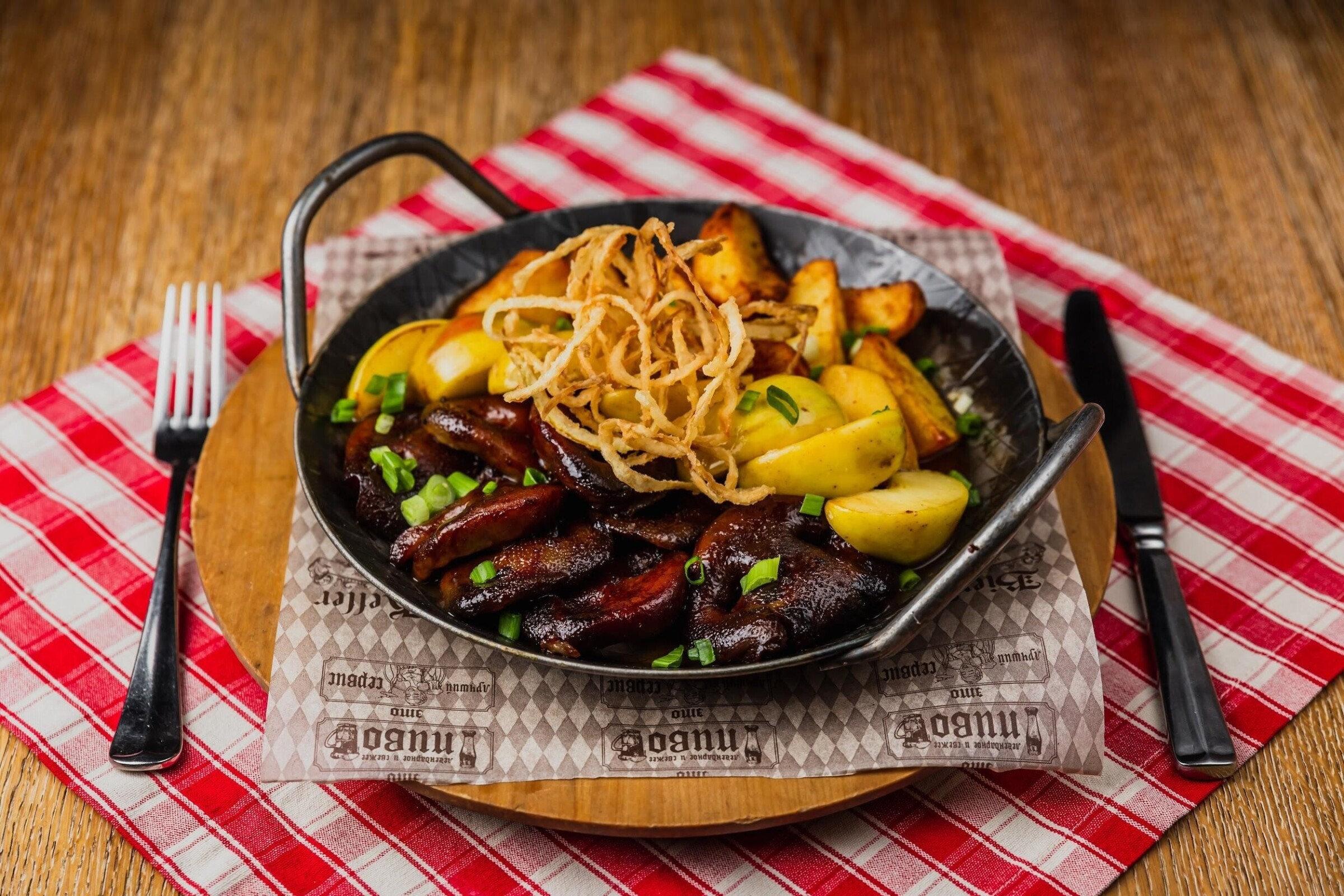 Фирменная сковорода с запеченными пятачками и ребрышками, нежными ломтиками говядины, томленой шеей и любимыми всеми колбасками. Подается с тушеной белой и красной капустой, картофельными дольками, острой и сладкой горчицей, хреном, свежим редисом и луковыми чипсами (70 рублей)
