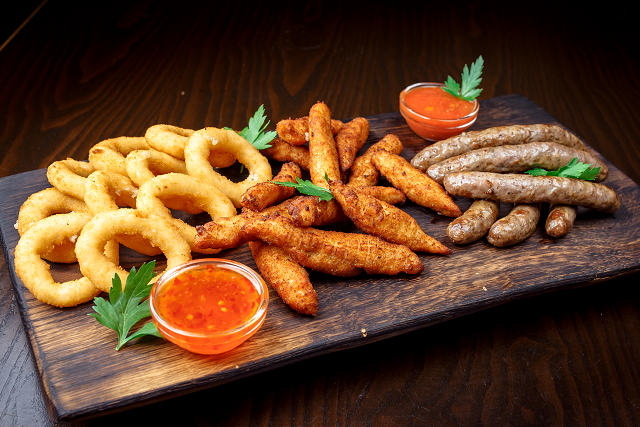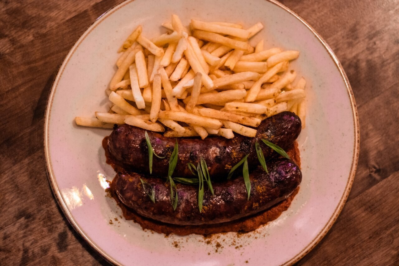 Свиная баварская колбаска с домашним томатным соусом карри и классическим картофелем фри (18,5 рубля)