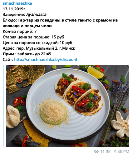 «Смачнаежка» — сервис, который продает остатки еды из минских ресторанов, кафе и пекарен. Цену на блюдо формирует заведение, скидка может достигать 75%. Например, вчера тартар из говядины в Ayahuasca Social Club можно было купить за 10, а не за 15 рублей.