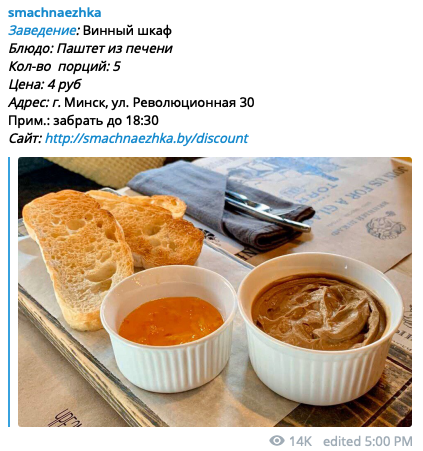 В первый день работы сервиса мы выставили брускетты с паштетом из «Винного шкафа» по 4 рубля вместо 7. Одну из порций купила моя приятельница и дала мне обратную связь: «Я столько лет хожу в это заведение и ни разу не заказывала паштет! А зря, очень вкусно».