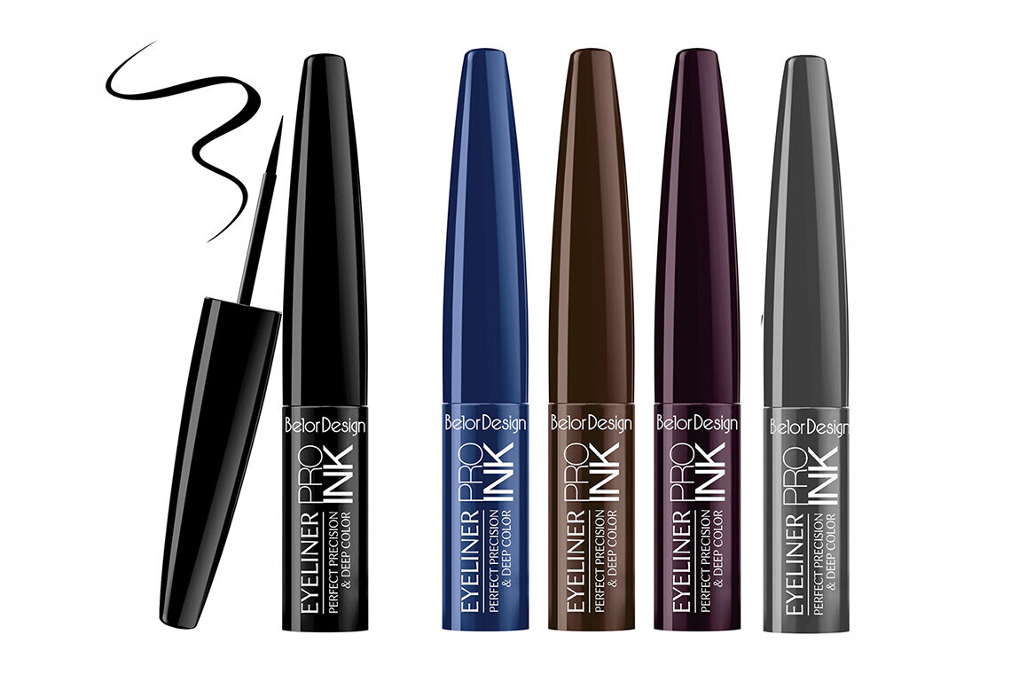 Цветовой диапазон PRO INK — пять глубоких оттенков с шиммерными частицами: черный, коричневый, синий, «баклажан» и «металлик», которые можно использовать самостоятельно поверх теней.