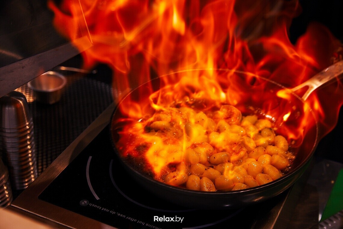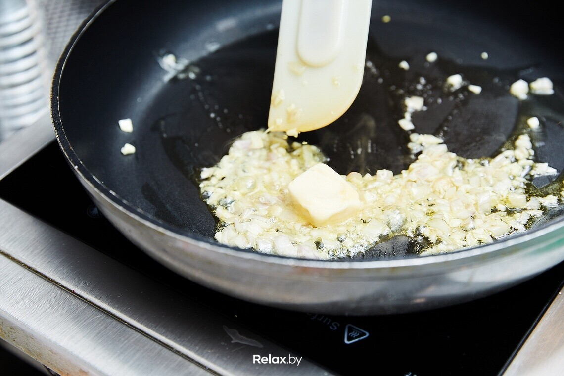 - Обжариваем до золотистого цвета, добавляем водку и фламбируем (поджигаем). В домашних условиях последний этап можно пропустить.