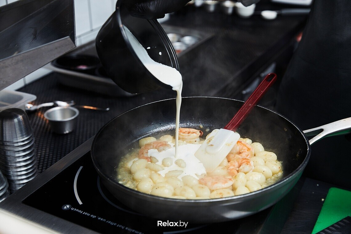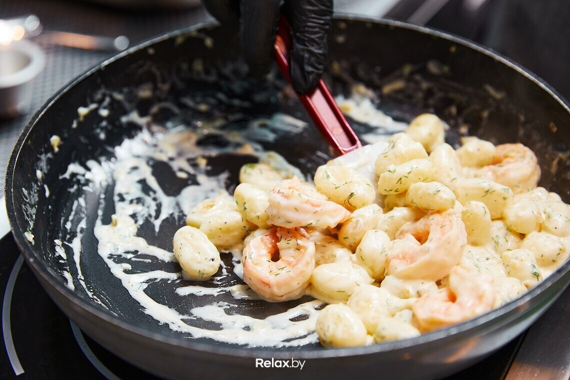 - В разогретую сковороду добавляем оливковое масло, нарезанный кубиками лук шалот, королевские креветки, чеснок, сливочное масло и отваренные ньокки.