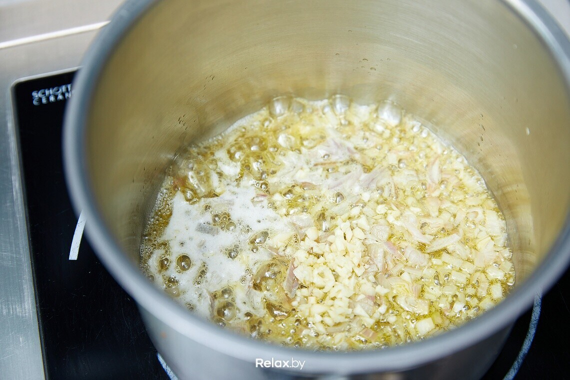 - На разогретую сковородку выливаем оливковое масло, кладем нарезанный мелкими кубиками лук шалот, обжариваем.