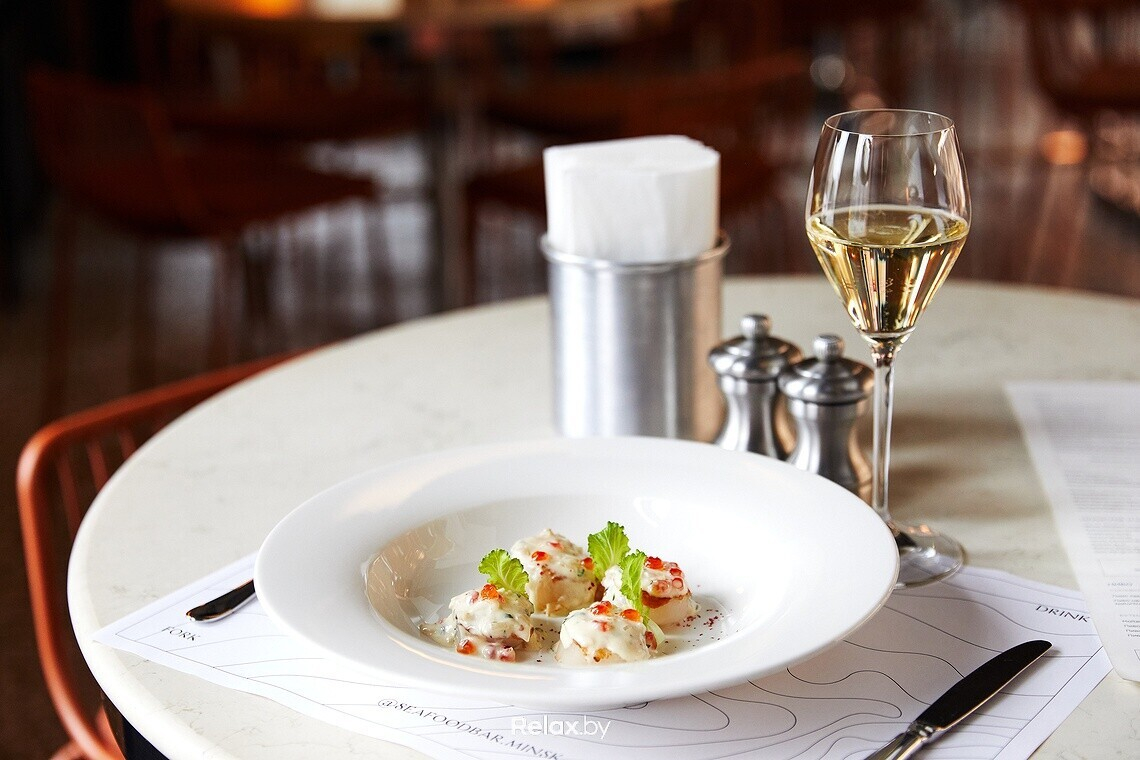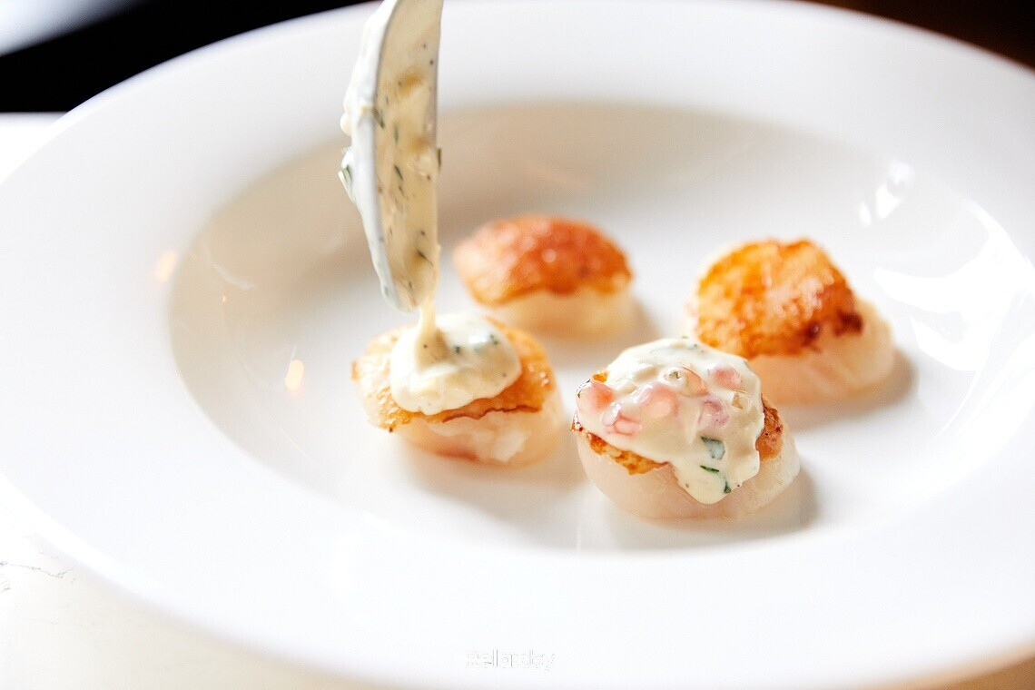 - Выкладываем гребешки в тарелку, поливаем соусом и декорируем гребешки икрой.