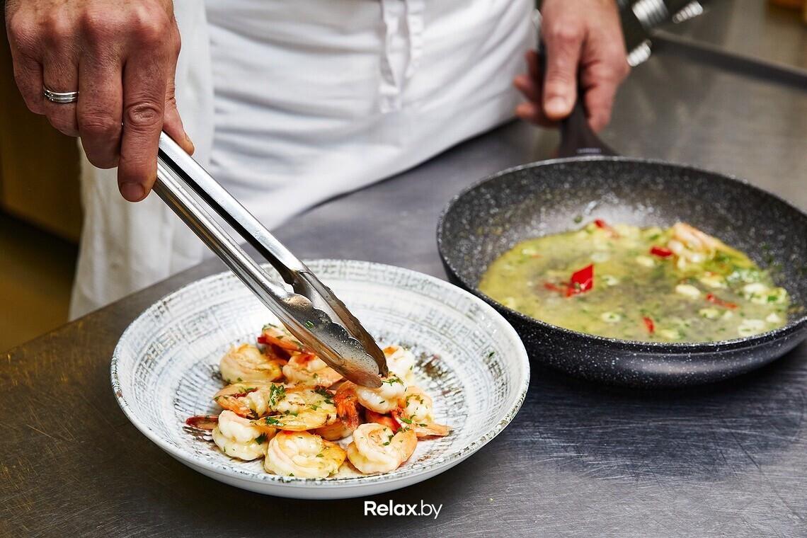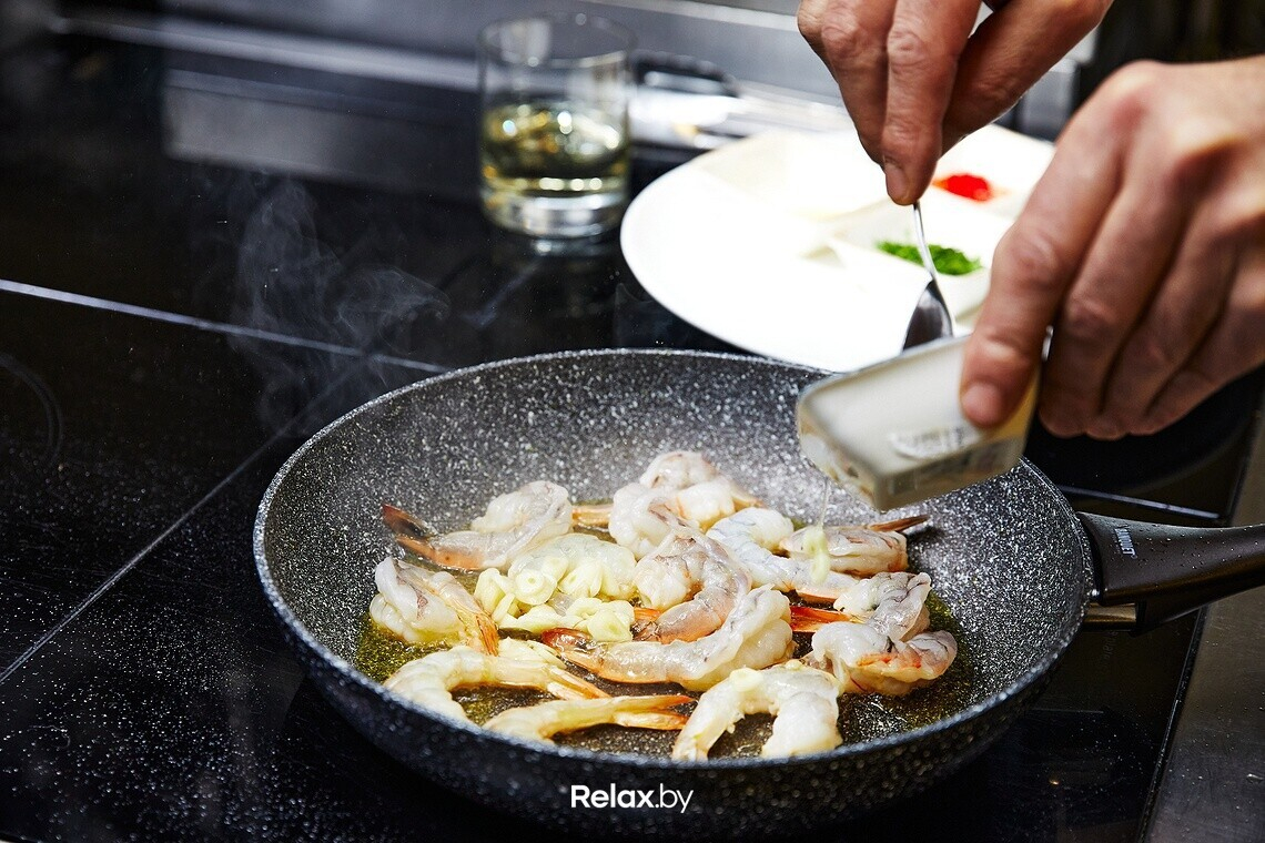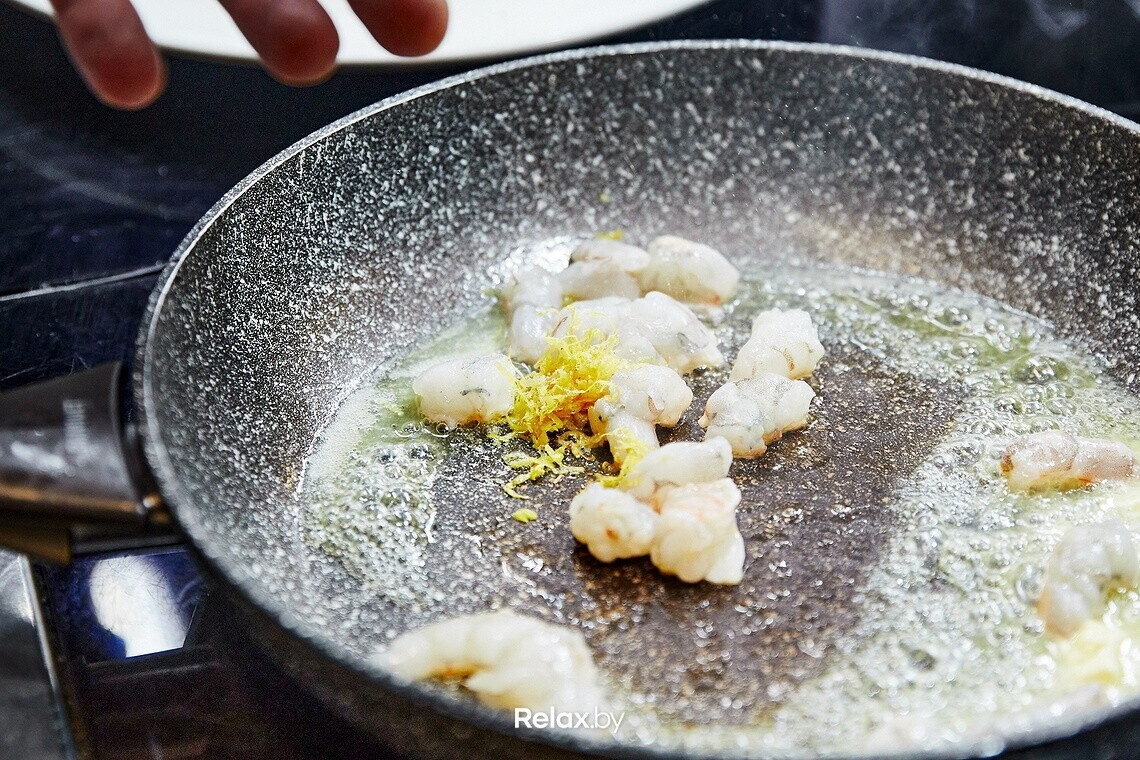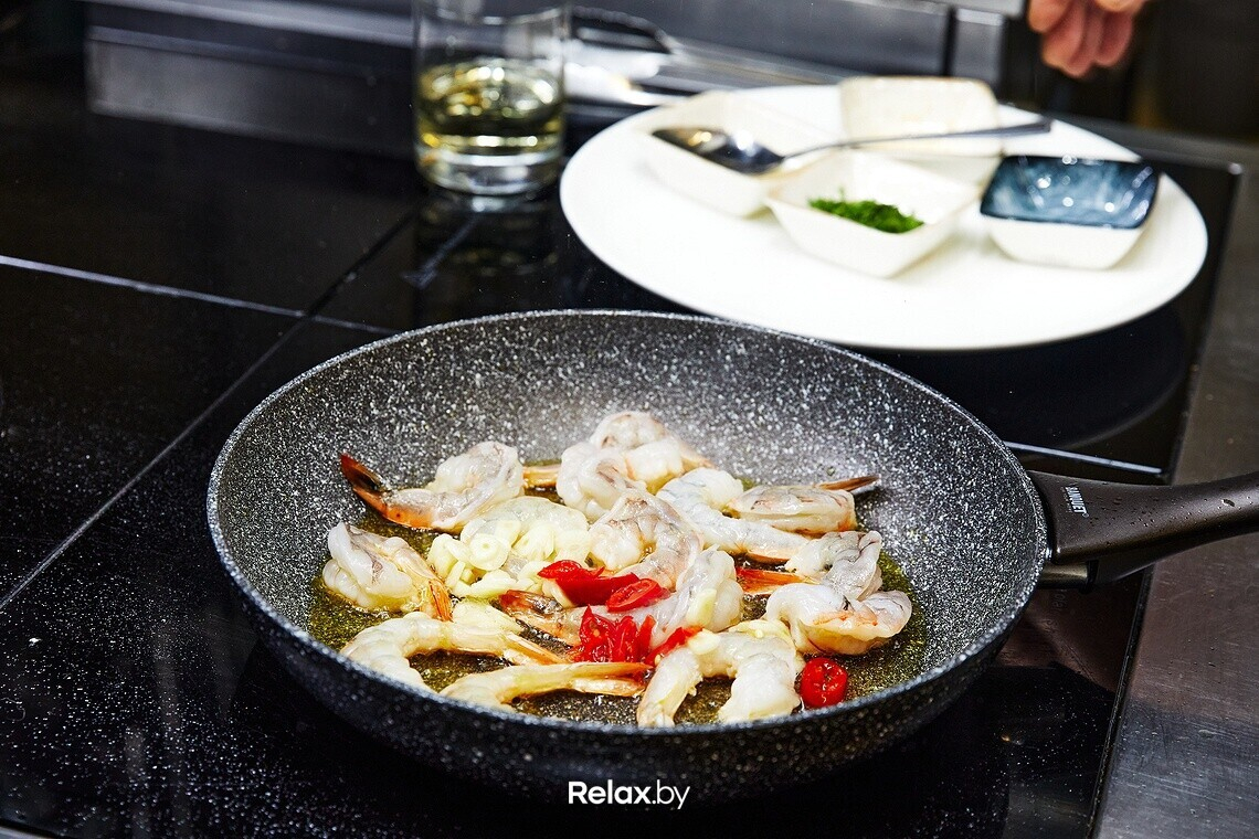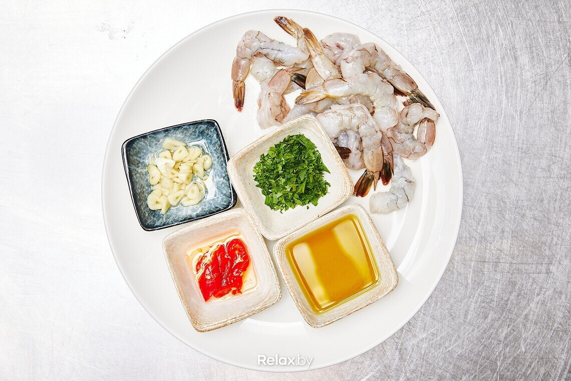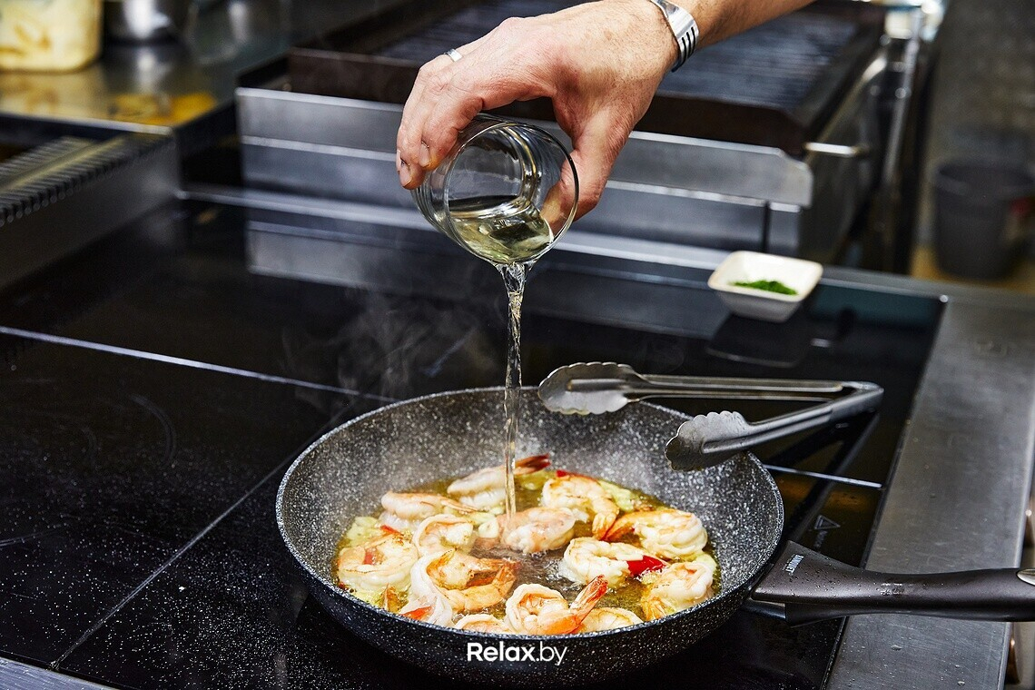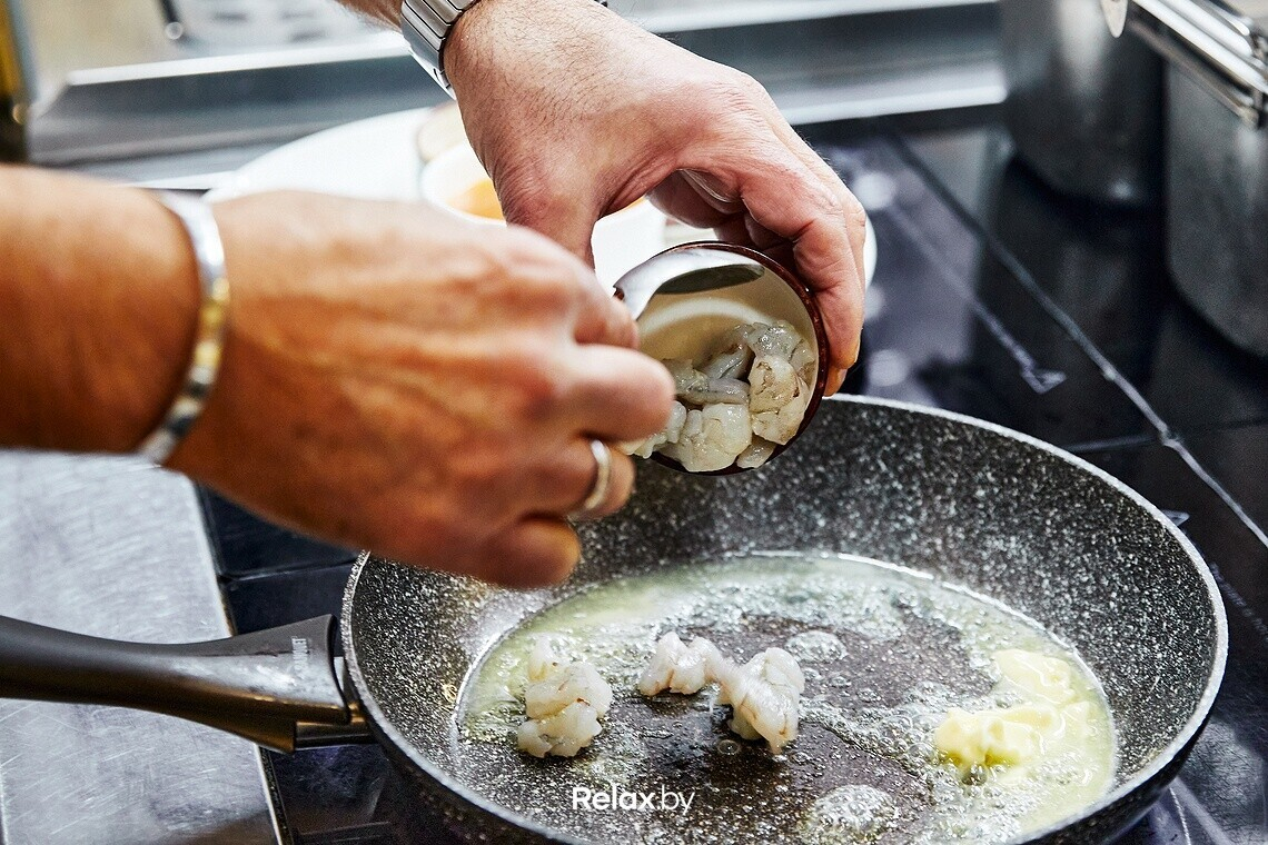 В Италии есть паста Алио Олио пеперончино, для нее используются такие же ингредиенты, как и для нашей горячей закуски. Шеф отмечает, что мясо креветок сладковатое и ему не хватает легкой кислинки от вина и остринки от перца.