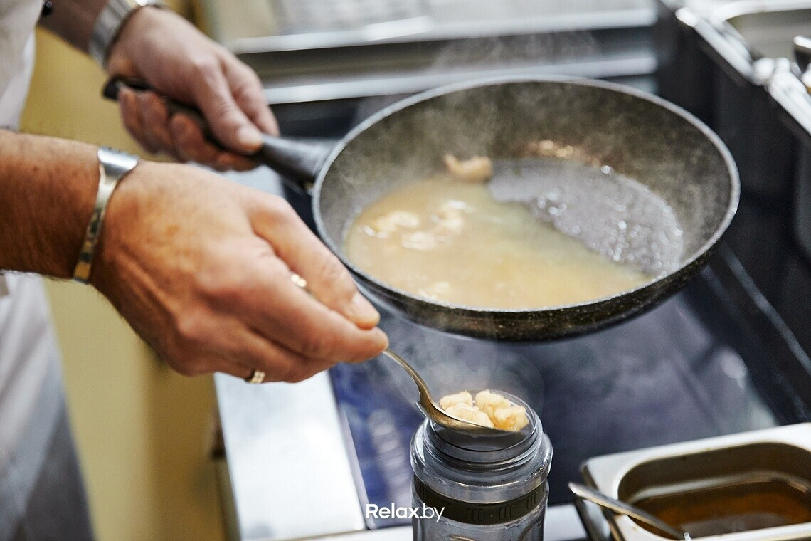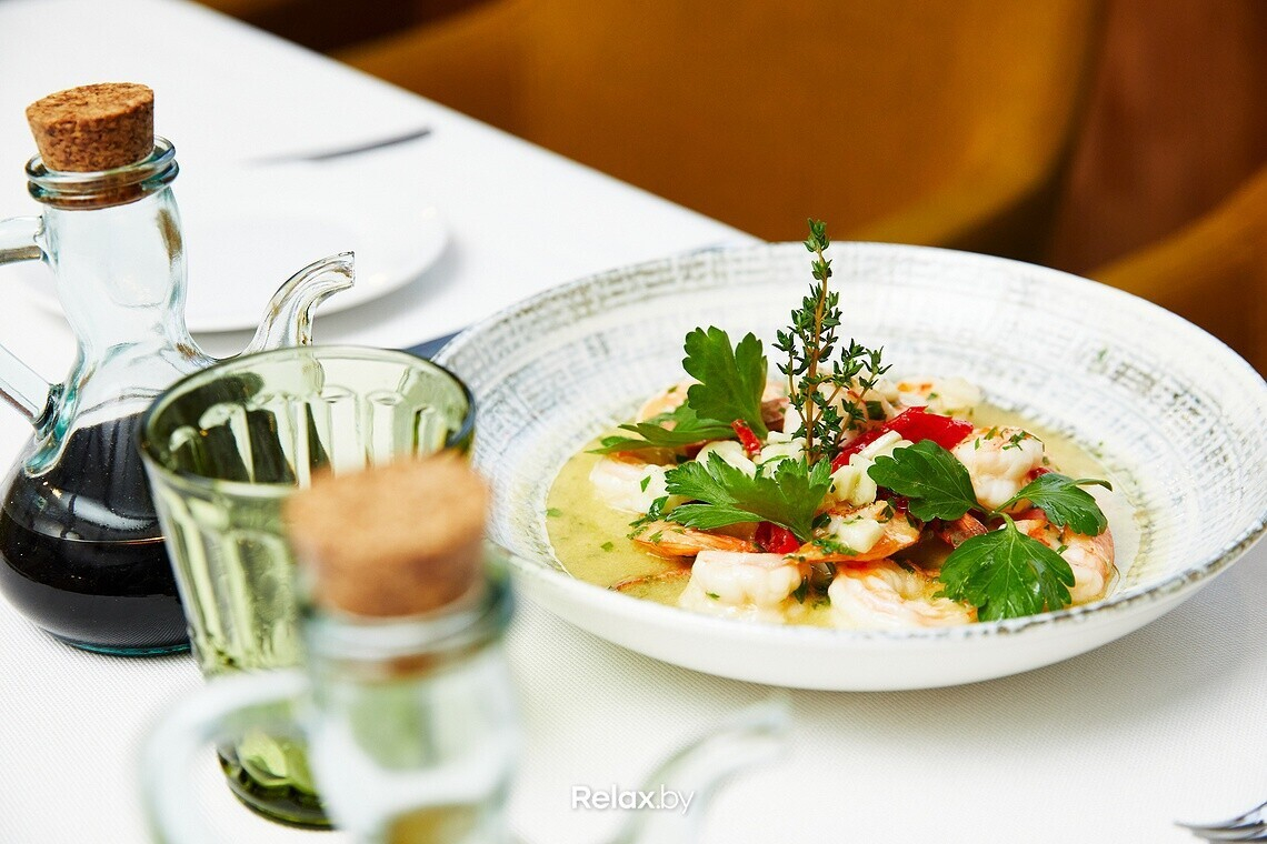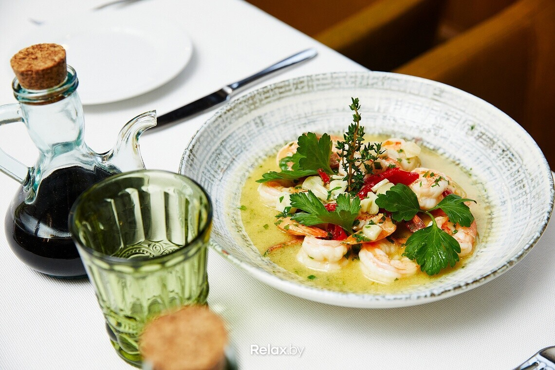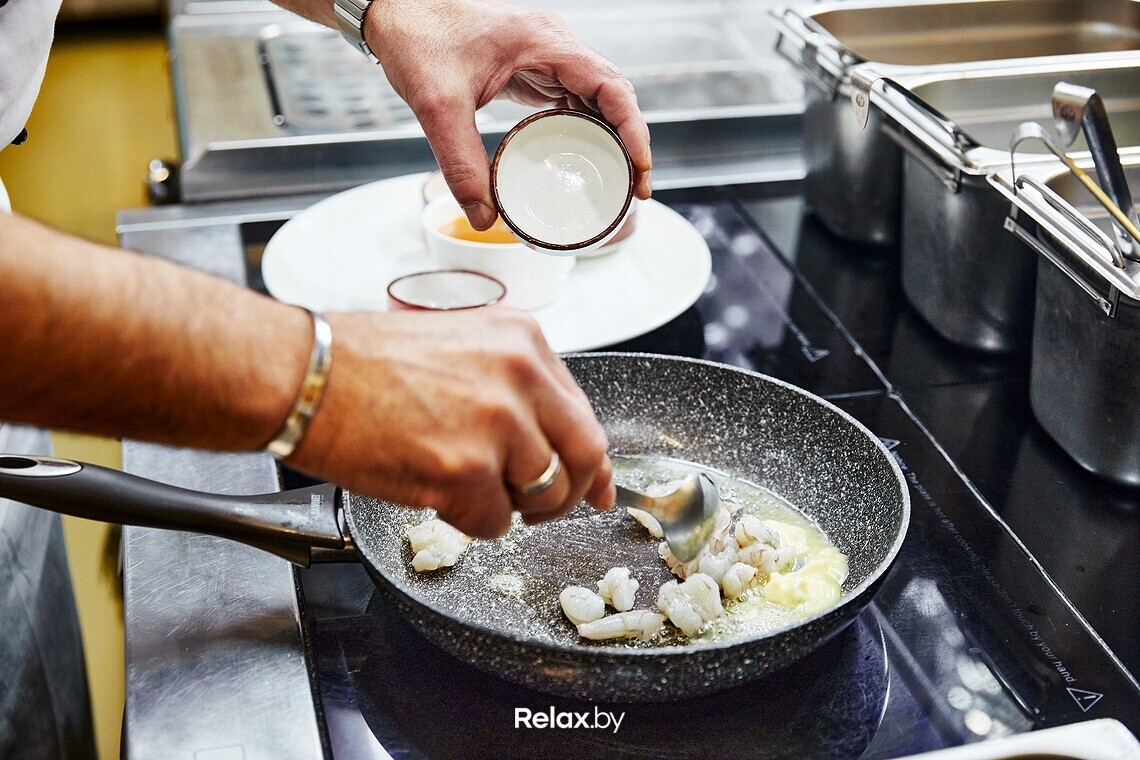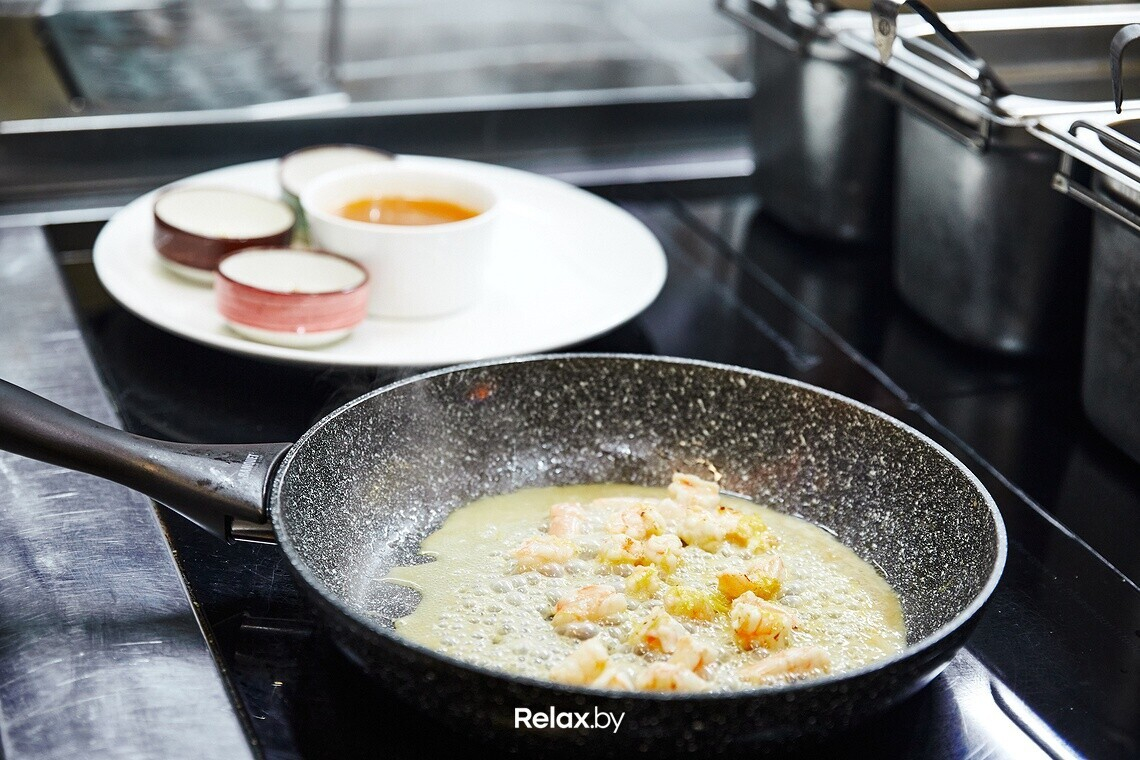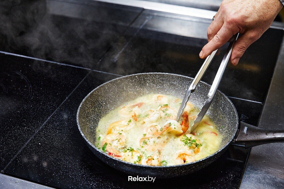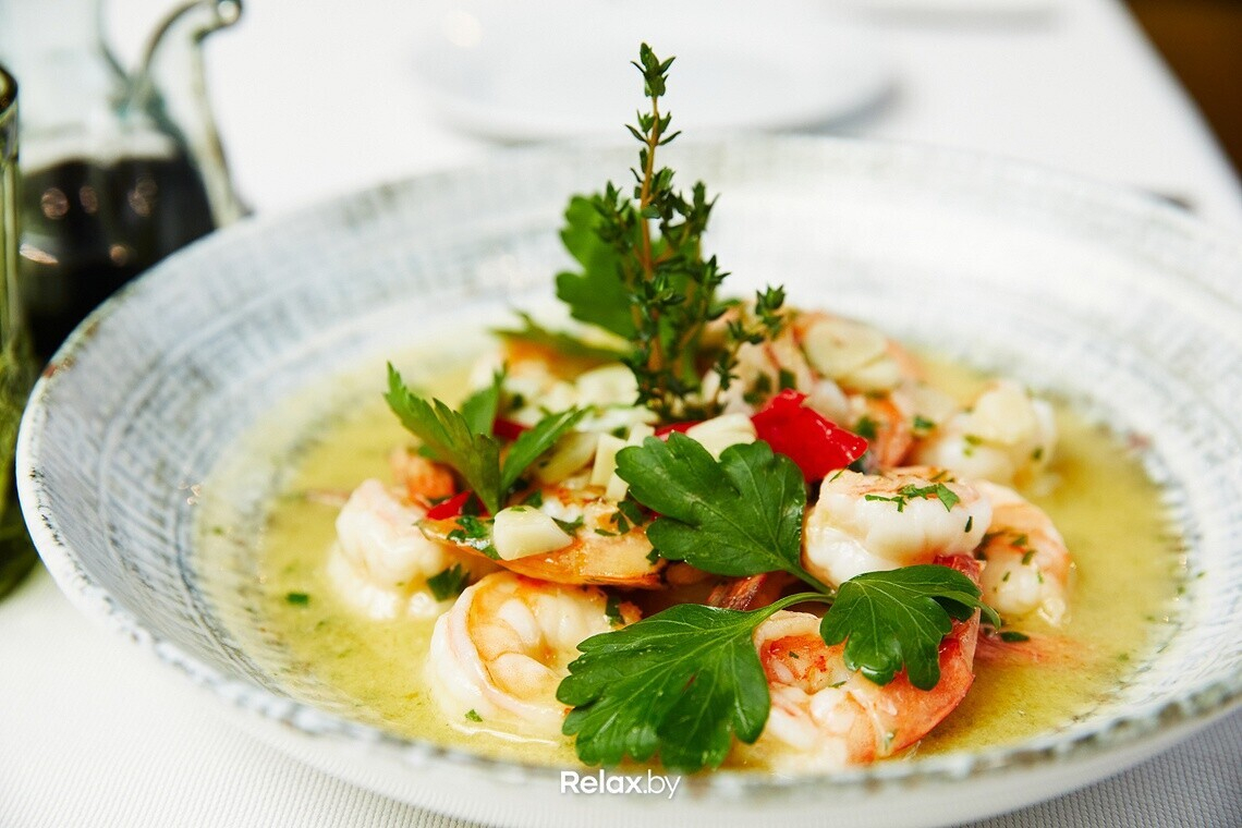 В Италии есть паста Алио Олио пеперончино, для нее используются такие же ингредиенты, как и для нашей горячей закуски. Шеф отмечает, что мясо креветок сладковатое и ему не хватает легкой кислинки от вина и остринки от перца.