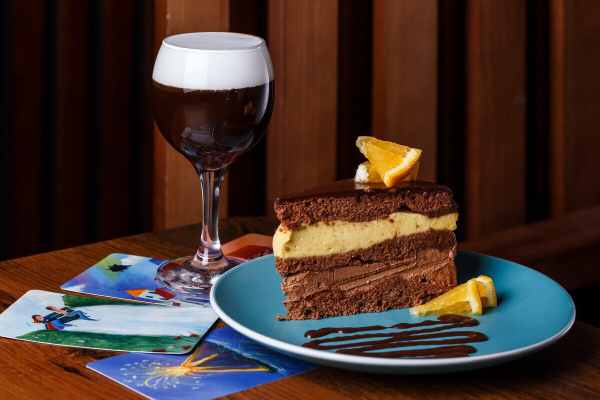 Состоит из шоколадного ганаша, апельсинового мусса и миндальных коржей.