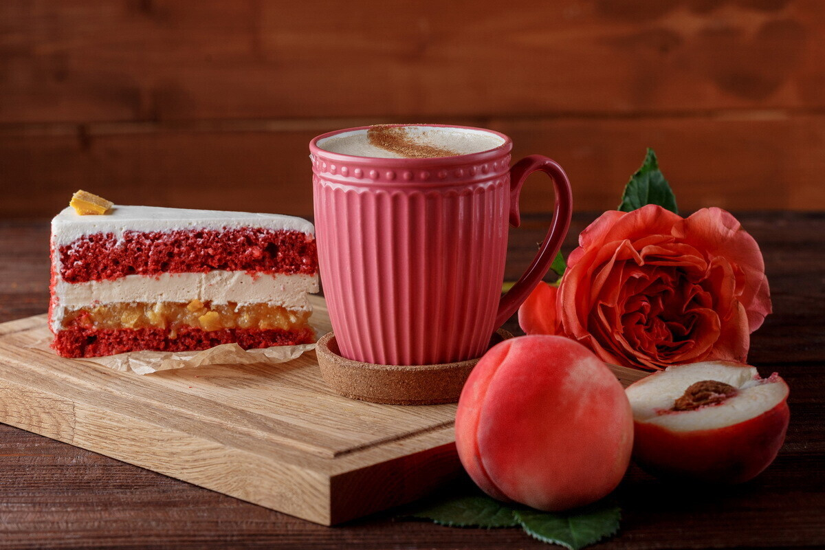Торт с бисквитом «Красный бархат», персиком и карамельной намелакой, 135 г