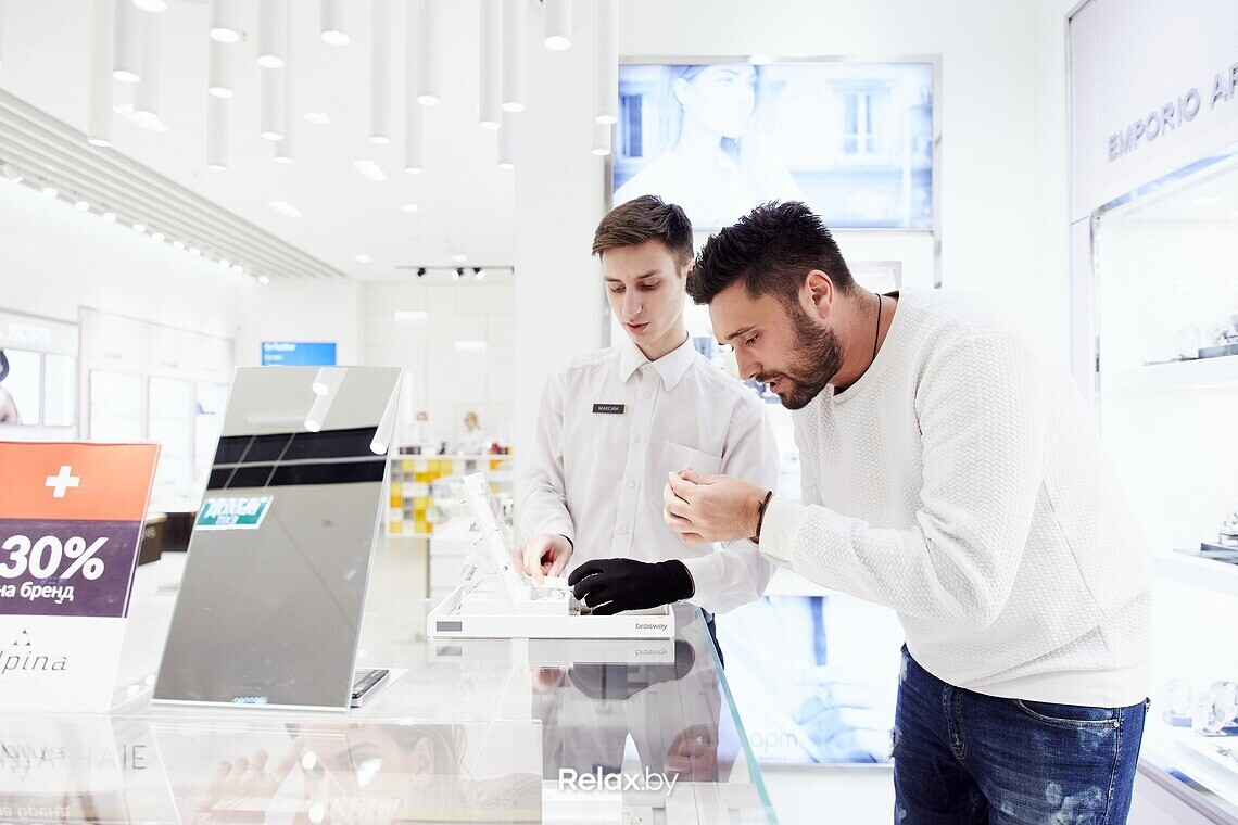 — В дополнение к этому набору можно приобрести еще часы. Вот эти вообще огонь! (показывает на часы от DKNY). Они отлично впишутся в наш комплект: серебристое покрытие, минималистичный дизайн. Таис обязательно оценит. Мне самому тоже нравятся маленькие циферблаты в часах, потому что они смотрятся максимально сдержанно и стильно.