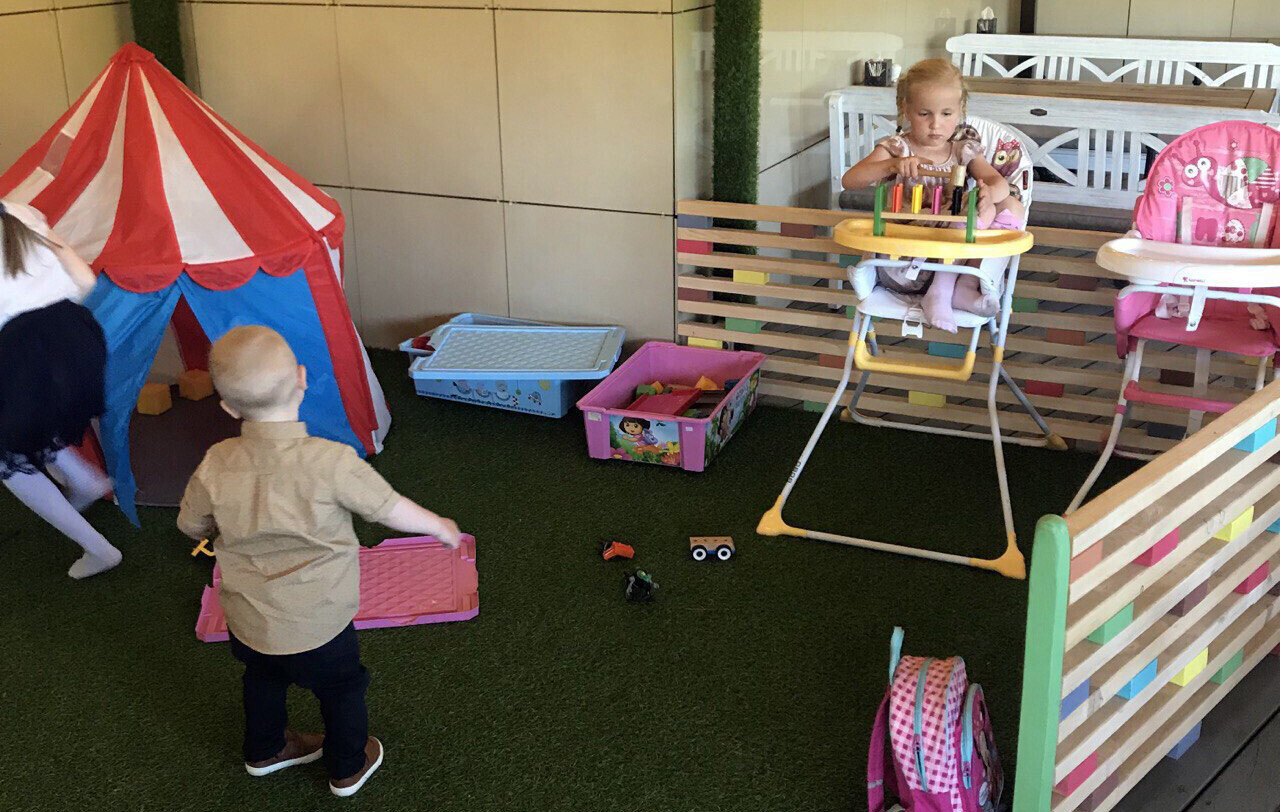 В детском уголке есть отдельная застекленная комната с сухим бассейном, мягкими гигантскими кубиками, машинками-каталками, трассой Hot Wheels (машинки докупаются отдельно). В детском меню — отдельные блюда для завтрака, супчики, горячее, мини-пицца, десерты и напитки домашнего приготовления.
