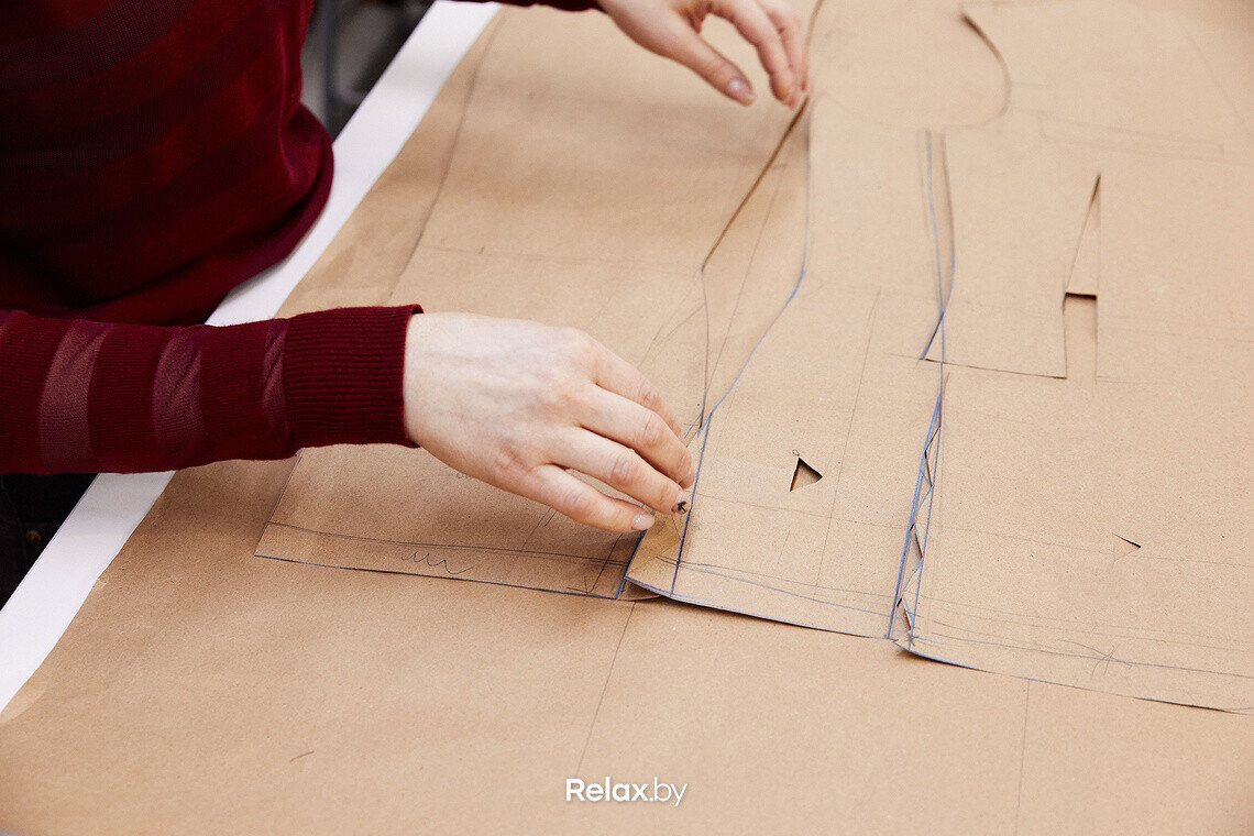 По завершении организационного этапа ткань поступает в производство. За дело берется конструктор. Зная параметры, размеры и особенности фигуры заказчика, он начинает создавать конструкцию. Попросту говоря, на большом листе крафтовой бумаги чертятся лекала (шаблоны), по которым будут выкраиваться на ткани элементы изделия. В нашем случае — пиджака.