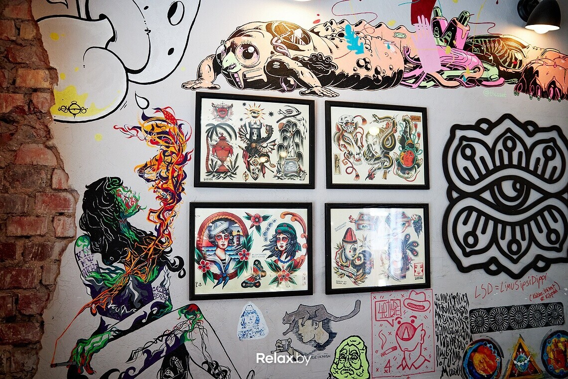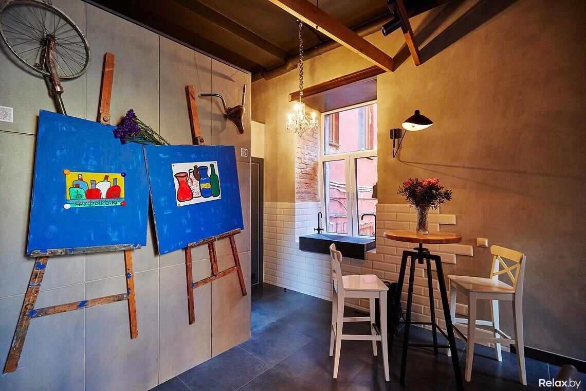 Этот небольшой бар в Красном дворике объединил под одной крышей разных представителей общества: юных эстетов, модных тусовщиков, а также творческую интеллигенцию. В его интерьере органично выглядят различные арт-объекты, среди которых — сувенир из Мексики, отсылка к Пикассо в виде седла от велосипеда и мольберт с работой знаменитого белорусского писателя и художника Адама Глобуса «Фуфырыкі». Ее нетривиальный подтекст удачно вписался в атмосферу бара и внес долю самоиронии. К слову, на соседнем мольберте висит работа дочери владелицы заведения Ксении, которая написана по мотивам работы Глобуса.