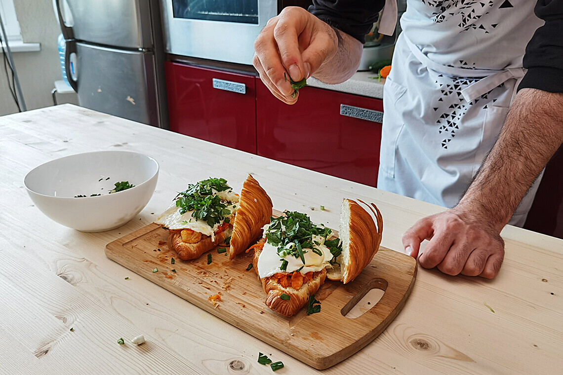 - Аккуратно делаем разрезы на круассане, чтобы заполнить его начинкой. Используйте самый острый нож на своей кухне, потому что свежий круассан из ремесленной пекарни будет крошиться.