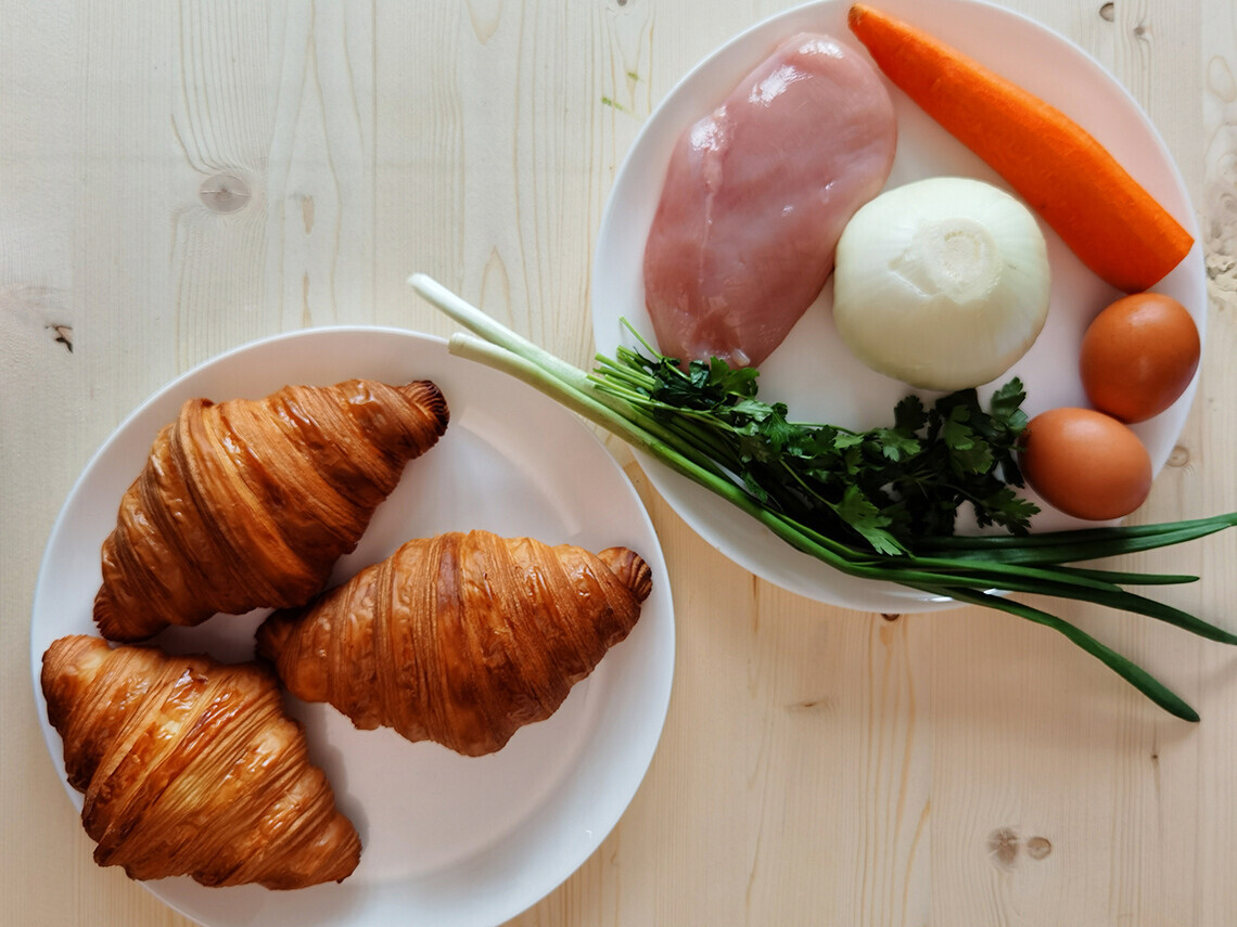 - Выкладываем в круассан начинку с курицей и параллельно обжариваем яйцо.