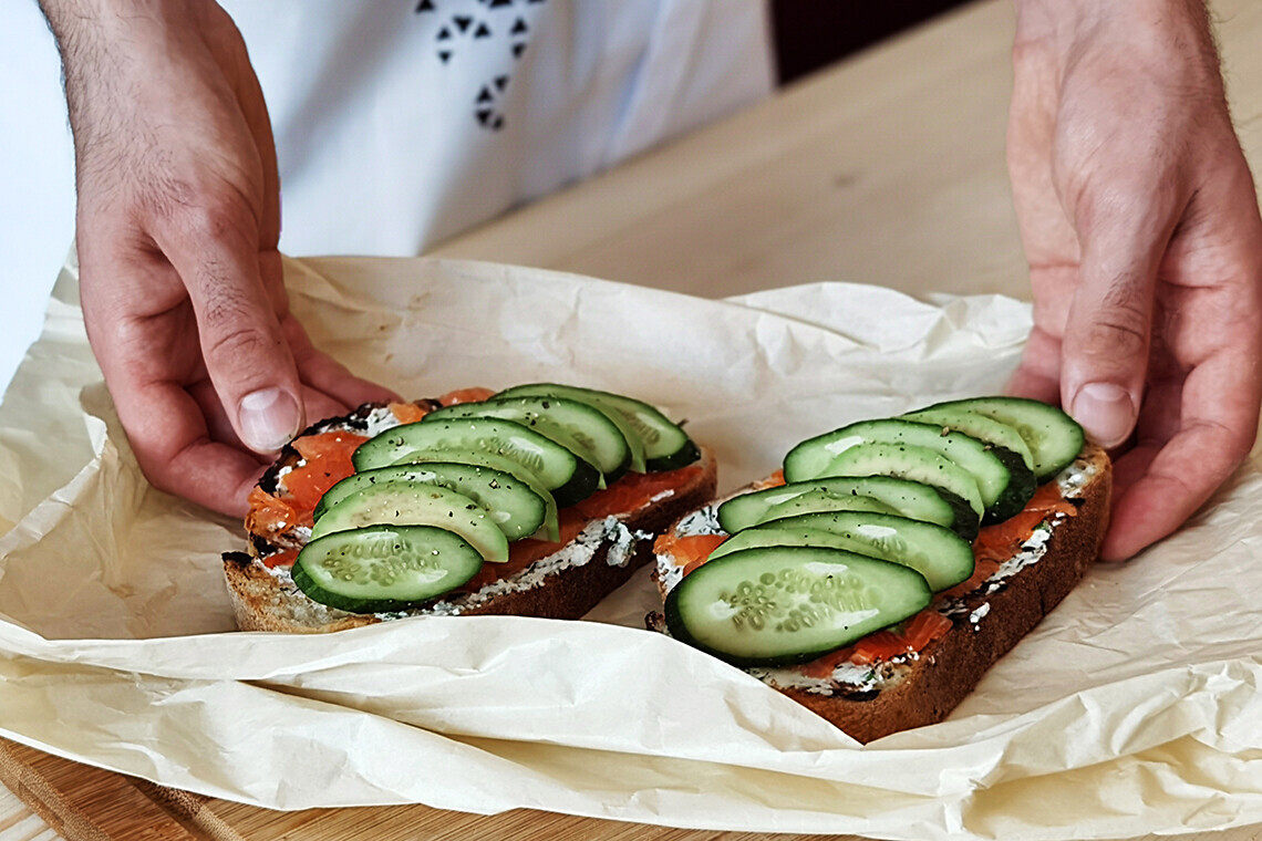 - Выкладываем авокадо и огурец на тост. Перчим по вкусу.