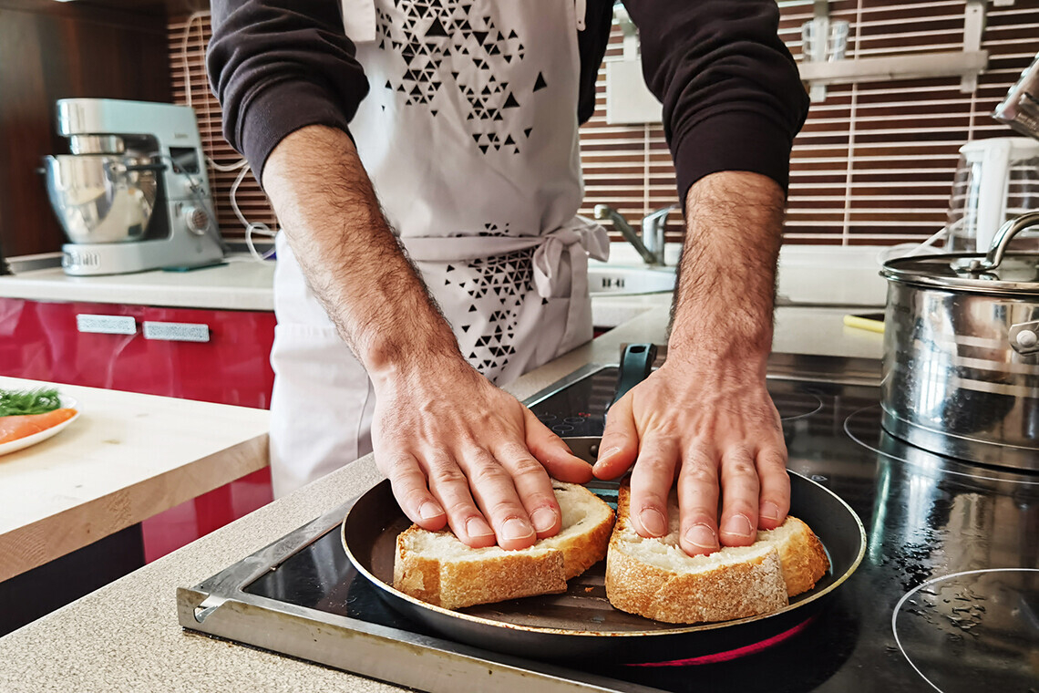- Разогреваем сковороду и выкладываем на нее тосты. Смазывать сковороду маслом не стоит. Смбат прижимает хлеб ладонью, чтобы он быстрее подсушился. Когда увидите легкую аппетитную корочку, переворачивайте: подсушиваем с двух сторон.