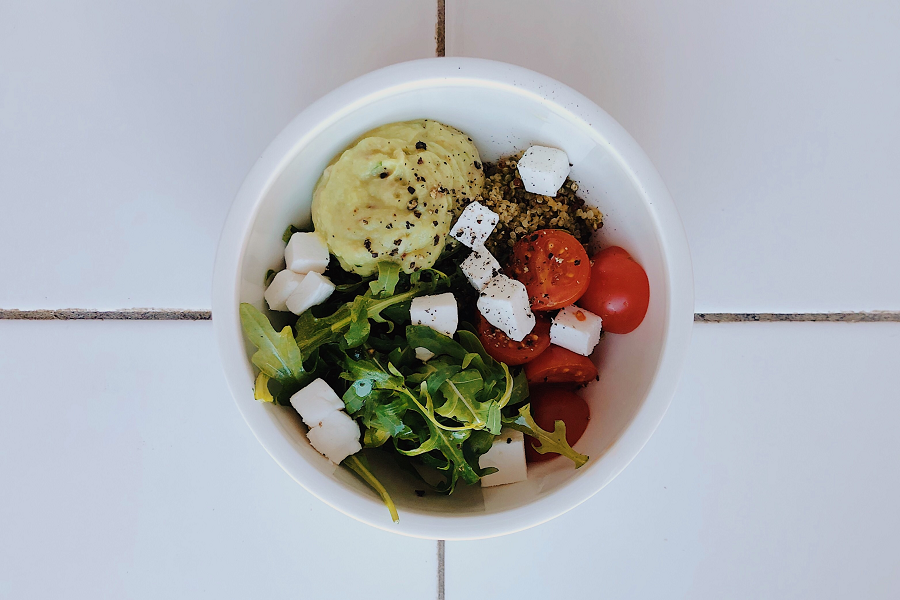 Киноа, авокадо, сыр фета, томаты черри, руккола и соус песто.