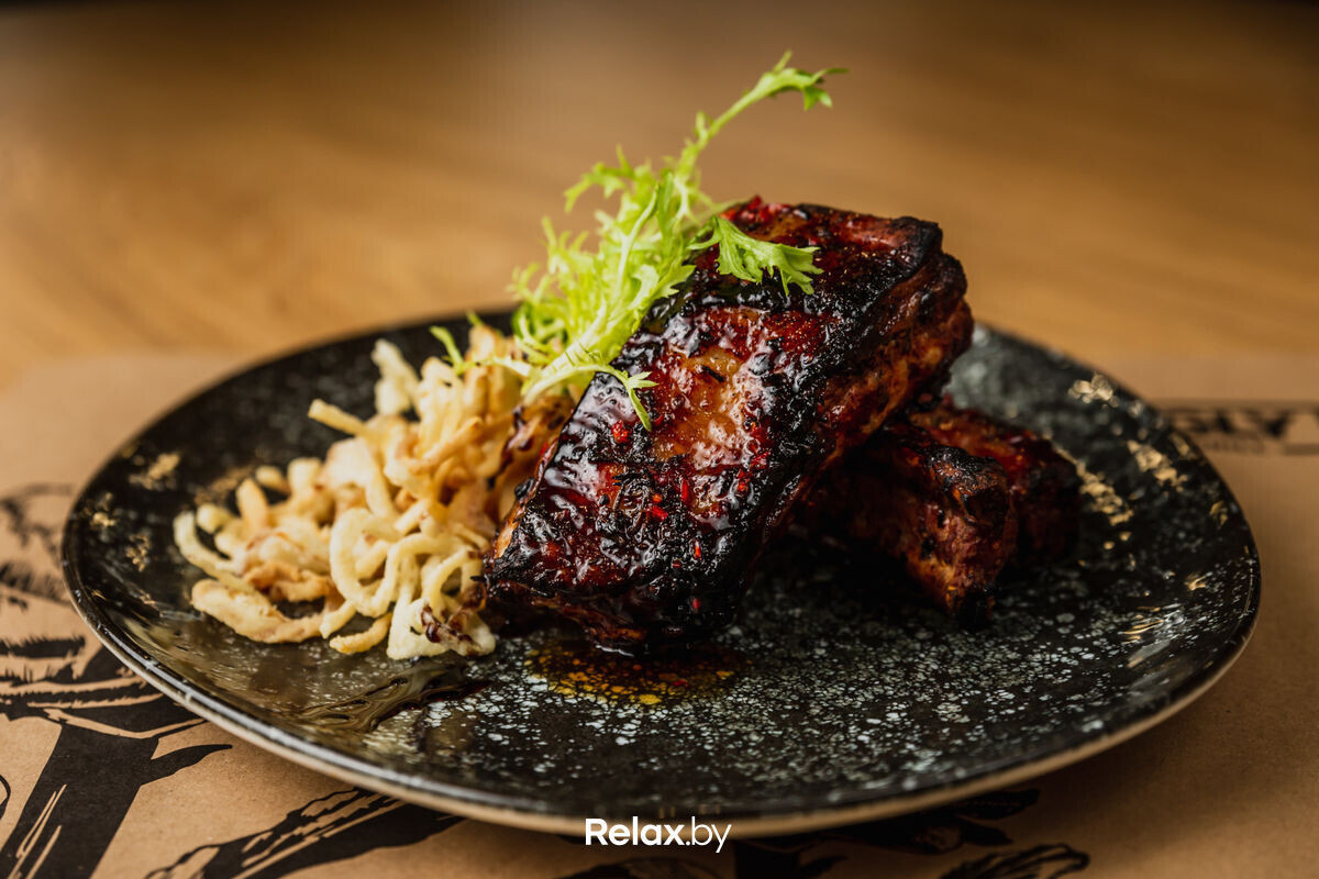 Ребра в глазури из мёда с перцем чили с луковыми кольцами, соус можно выбрать дополнительно
