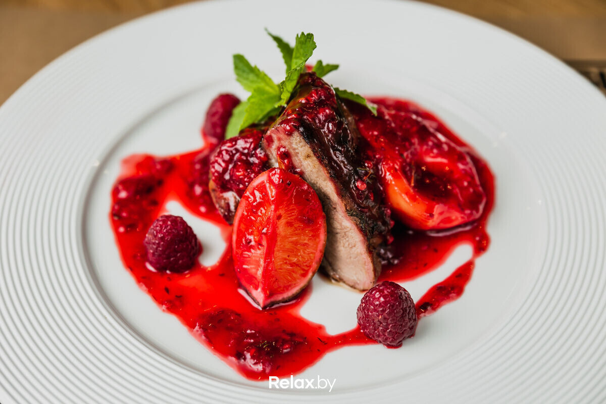 Филе утки с кожей, груша, лайм, апельсин, клюква, малина